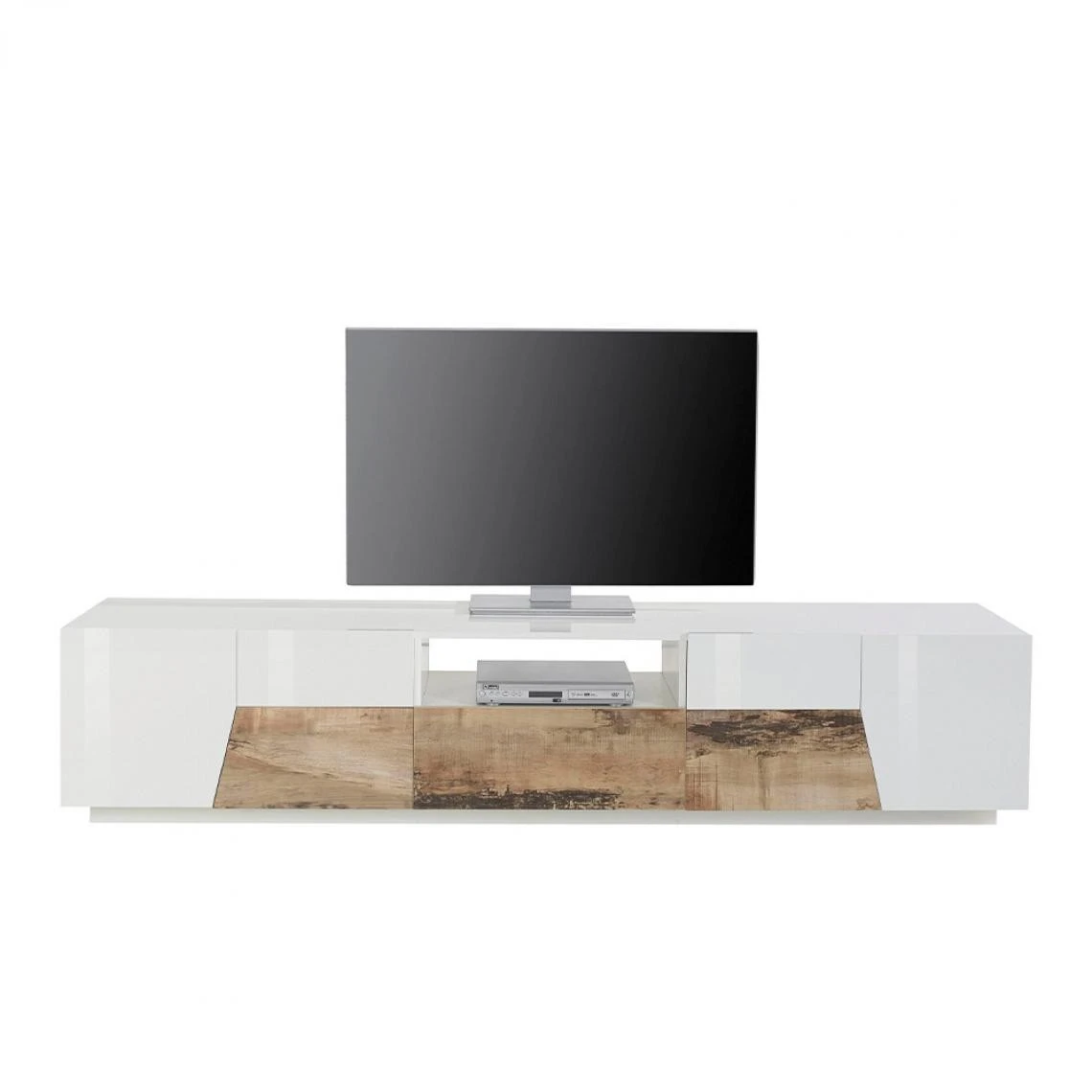 Complet avec deux grands compartiments avec ouverture à charnière, un tiroir coulissant, un compartiment ouvert et une longue zone de support pour un téléviseur grand écran, ce meuble TV au design italien incomparable est capable de créer un splendide point central dans le salon grâce à sa ligne particulièrement simple, il peut être inséré avec succès dans la plupart des intérieurs modernes et anciens. Dans les deux compartiments latéraux et dans le tiroir coulissant, il est possible de ranger toutes sortes d’objets et d’accessoires utiles à garder à portée de main grâce à sa profondeur de 43 cm ; dans le compartiment ouvert, vous pouvez placer n’importe quel appareil numérique accompagnant le téléviseur, tel que le décodeur, la console de jeux ou le routeur pour Internet. La partie supérieure peut certes servir à accueillir de grands téléviseurs, mais elle peut également servir de surface de service sous l’écran si elle est fixée au mur ; de cette façon, vous pouvez afficher les objets les plus variés de la maison et embellir le meuble avec des décorations, des bibelots, des plantes d’intérieur, des sculptures, des cadres, etc. La structure est fabriquée avec des matériaux de première qualité garantis Made in Italy en utilisant uniquement du bois certifié FSC, elle n’a pas de pieds de support, mais entre en contact direct avec le sol qui offre une excellente stabilité.