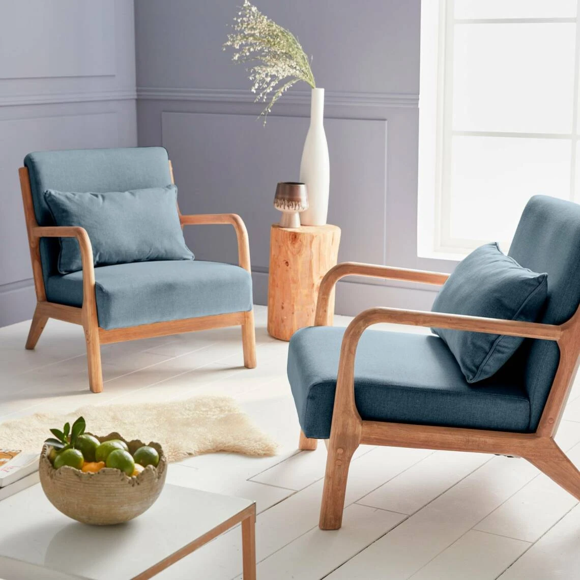 Points forts Alice’S Garden Fauteuil design bleu en bois et tissu pieds compas scandinave – Lorens
