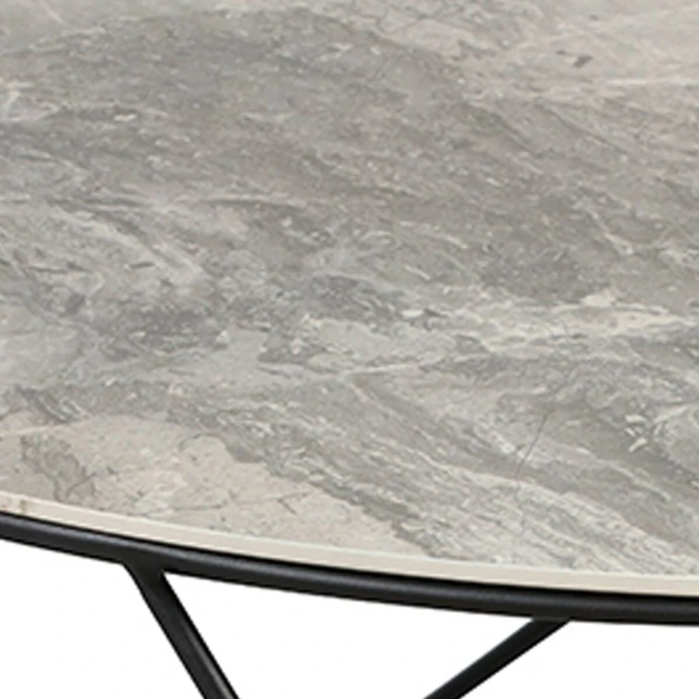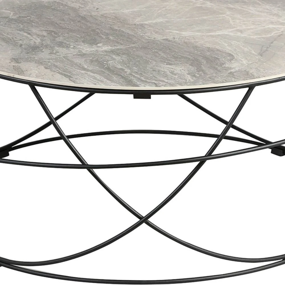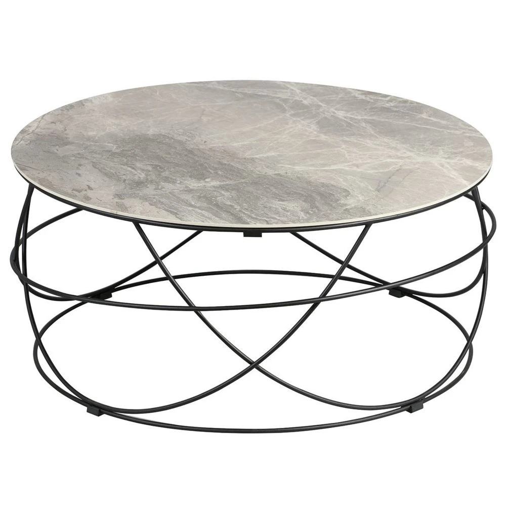 Table Basse Ronde Cathleen. Une table arborant une élégante structure en acier, surplombée par un large plateau en céramique. Peut s’adapter à divers styles d’intérieurs.