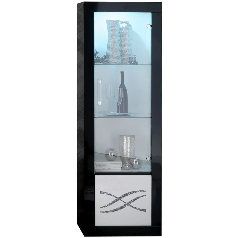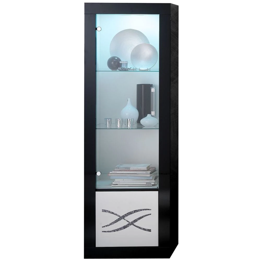 Vitrine 1 Porte : Structure panneaux de particules, finition laqué noir et blanc brillant. Façade porte en panneaux de particules blanc et verre. Tablettes en verre. Motif vaguelettes finition pailletée sur la façade. Eclairage Led intégré.