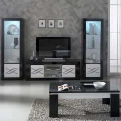 Ensemble salon complet Victoria Luxury composé d’une table basse, d’un meuble TV, d’une vitrine 1 porte droite et d’une vitrine 1 porte gauche. Un ensemble complet pour un coin salon au ton contemporain, et disposant d’un maximum de rangement.