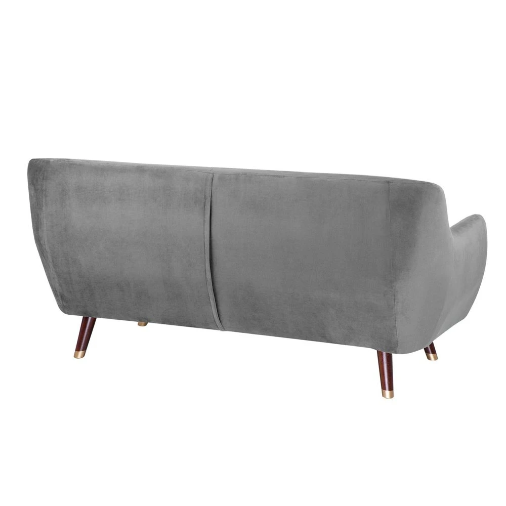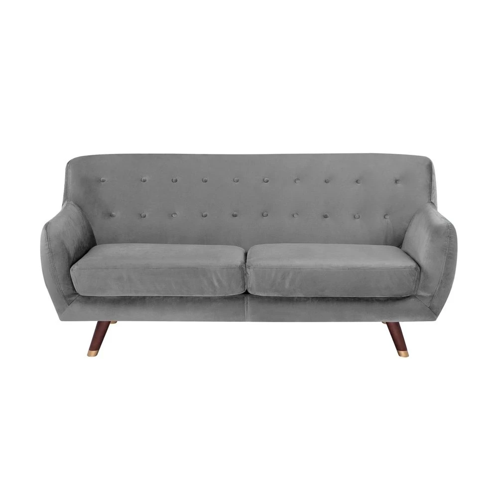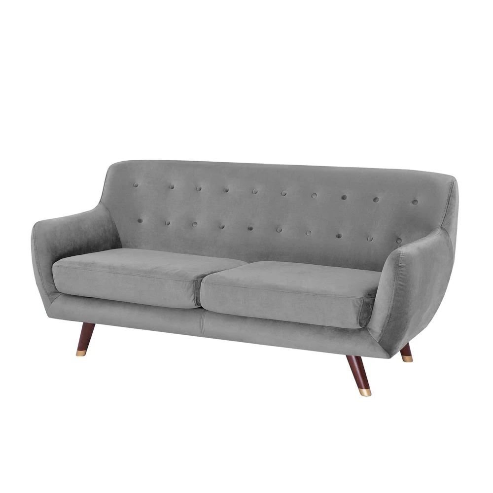 Le dossier profilé avec boutons décoratifs et les accoudoirs arrondis confèrent à ce canapé 3 places gris un joli look élégant. Le charme rétro est complété par le revêtement en velours doux et le toucher doré des pieds en bois. Les housses de coussin de siège sont amovibles pour faciliter l’entretien.