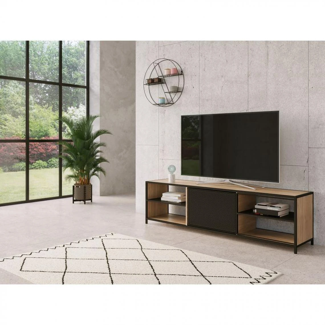 Ce meuble TV d’une longueur de 180 cm peut accueillir un grand écran sur pied, d’un poids de 100 kg et d’une diagonale de 75 cm au maximum. Ce meuble TV dispose de trois niches, dont deux ouvertes avec une tablette et une fermée par une porte coulissante, dotée d’un fond avec trou passe-câbles.