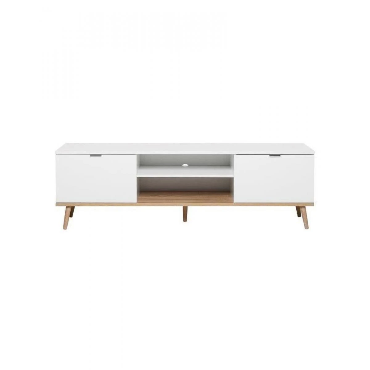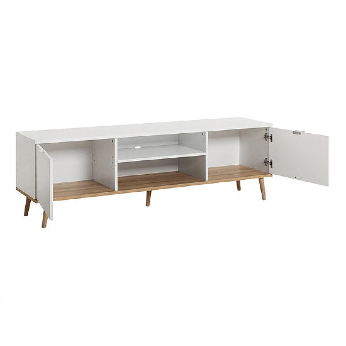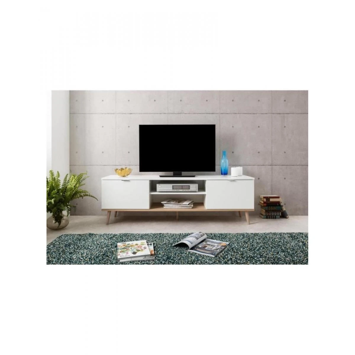 Points forts But Meuble TV blanc design scandinave avec 2 portes à compartiments ouverts en bois Ekraan