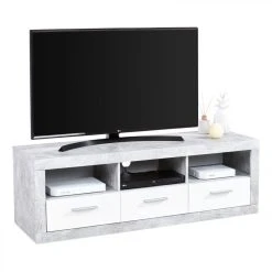 Niche3. . Teinte :effet béton/blanc. . Tiroirs :3. . Structure :panneaux de particules, recouvert de papier décor effet béton. . Charge maxi TV :40 kg. . A monter soi-même. . Dimensions en cm :L. 147 – H. 49 – P. 45. . Façades de tiroirs :panneaux de particules . Taille diagonale max écran (cm/pouce) :55″ (140 cm). .