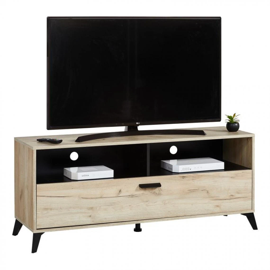 Pieds :en plastiques. . Chants :bande de chant en mélamine. . Teinte :imitation chêne gris/ noir. . Garantie :2 ans, pièces. . Poignées : en plastique. . Structure :panneaux de particules mélaminé 16 mm. . Charge maxi TV :35 kg. . A monter soi-même. . Dimensions en cm :L.137,5- H.57,5- P.40. . Taille diagonale max écran (cm/pouce) :55”/ 140 cm. . Dispo pcs détachées donnée fournisseur :2 ans. .