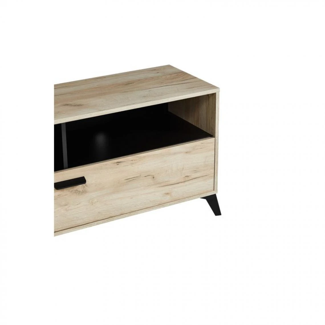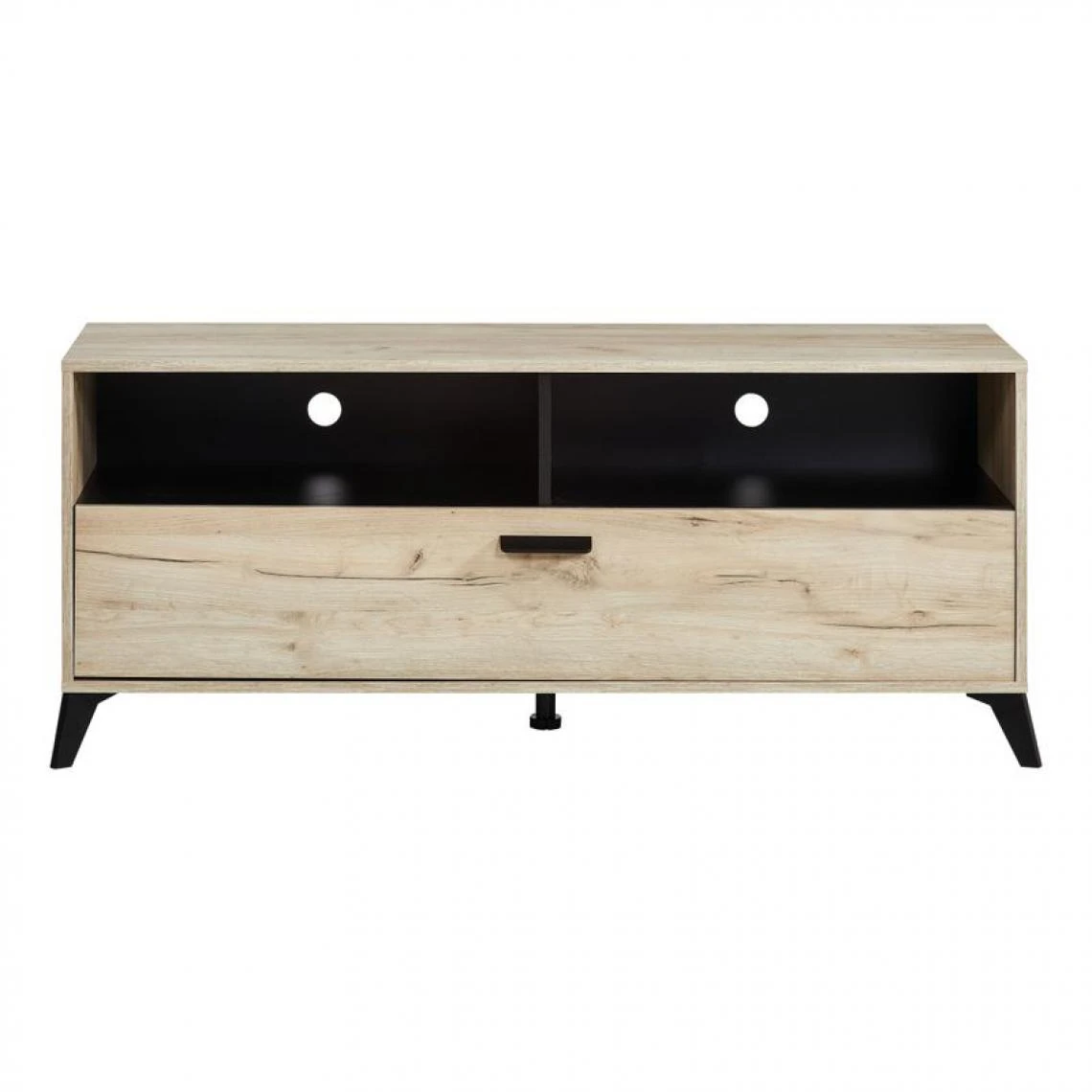 Laissez-vous séduire par l’allure industrielle de ce meuble TV avec niches de rangement. Conçu en Europe, ce meuble se caractérise par une structure en panneaux de particules imitation chêne gris, qui contraste élégamment avec sa poignée et son piètement noirs. Idéal pour les petits espaces, ce meuble TV présente une taille compacte.