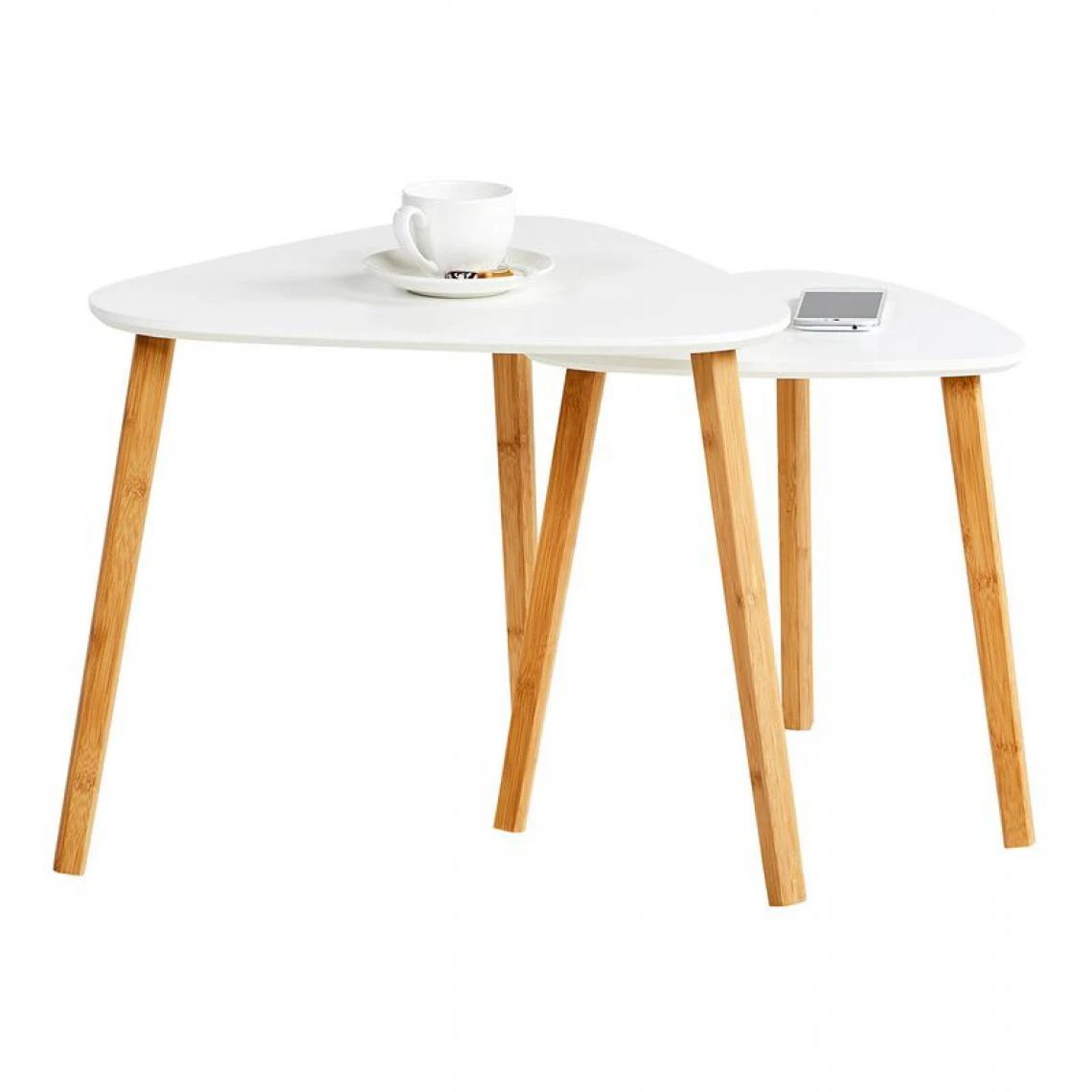 Ces tables basses gigognes de dimensions L. 55 x H. 55 x P. 45 cm et L. 40 x H. 40 x P. 40 cm correspondent à de nombreux styles et sont les meubles incontournables d’une déco scandinave. Le plateau laqué blanc, associé à des pieds en bambou massif naturel, offrent un style chic et nordique très tendance.