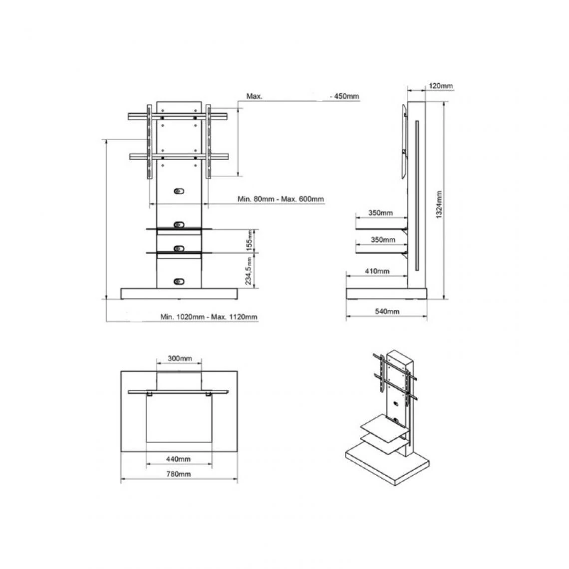 Dimensions : * Longueur : 78 cm * Profondeur : 54 cm * Hauteur : 132.5 cm * Structure : MDF haute brillance. Couleur : noir Système de fixation pour l’écran : oui Système de cache-câbles : oui Poids maximum supporté : 40 kg * 2 étagères en verre trempé bleu – Dimensions : Longueur 420 x Profondeur 340 mm – Hauteur entre les étagères : 115 mm Caractéristiques des colis : ** Colis 1 : l : 60 cm x H : 23 cm x L : 129 cm – Poids : 29 kg Accessoires de montage Notice de montage Meuble à monter soi-même Garantie fabricant 24 mois Norme CE
