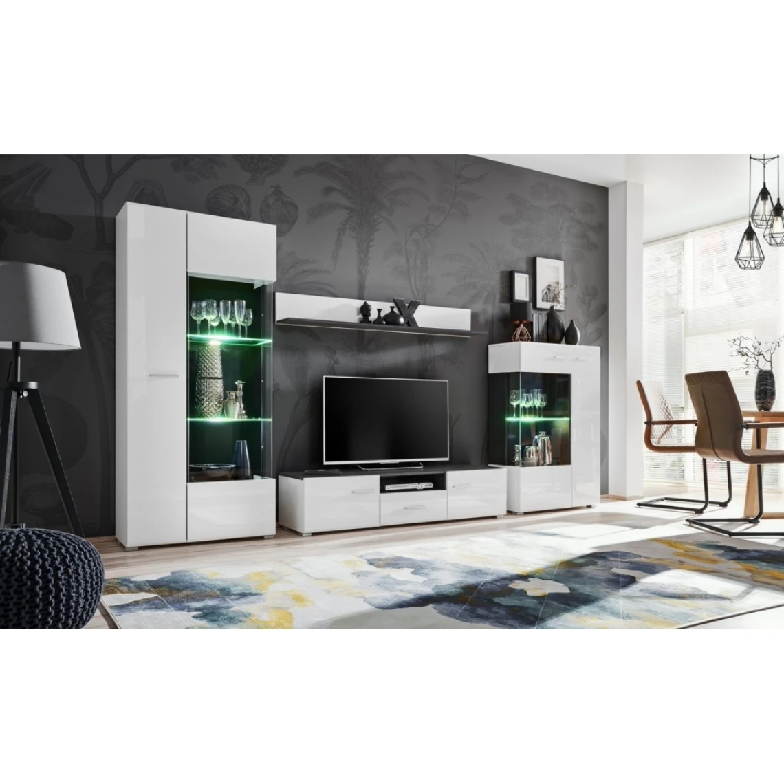 Ce meuble comprend un meuble TV avec 2 placards + 1 tiroir, une grande vitrine-armoire, une vitrine sur pieds et une étagère ce qui vous redonne le plaisir des soirées devant votre TV.