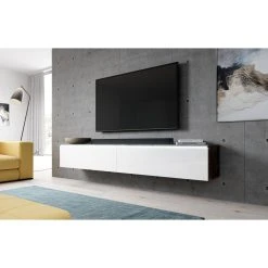 Points forts Furnix Meuble tv debout / suspendu BARGO 180 x 32 x 34 cm style contemporain vieux bois mat / blanc brillant sans LED