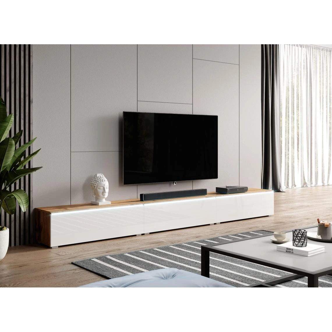 Points forts Furnix Meuble tv debout / suspendu BARGO 300 (3×100) x 32 x 34 cm style contemporain chêne wotan mat / blanc brillant sans LED