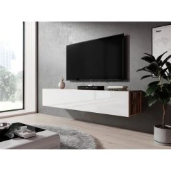 Zibo est fabriqué en panneaux MDF de haute qualité, c’est une construction simple qui s’adapte parfaitement aux intérieurs de styles différents. Trois compartiments fermés offrent un immense espace de rangements pour ranger vos objets privés ou vos accessoires tv comme vous voulez. Le meuble tv Zibo, accroché au mur, donnera à votre pièce de l’élégance et rendra le ménage courant plus facile et plaisant. Le meuble tv Zibo : une touche de modernité dans votre salon ! Les dimensions de meuble tv Zibo : hauteur : 34 cm largeur : 160 cm profondeur : 34 cm Notez bien : Vu la variété de types de murs (par exemple : plaques de plâtres, béton, etc.) les supports muraux et les fixations ne sont pas joints aux commandes.