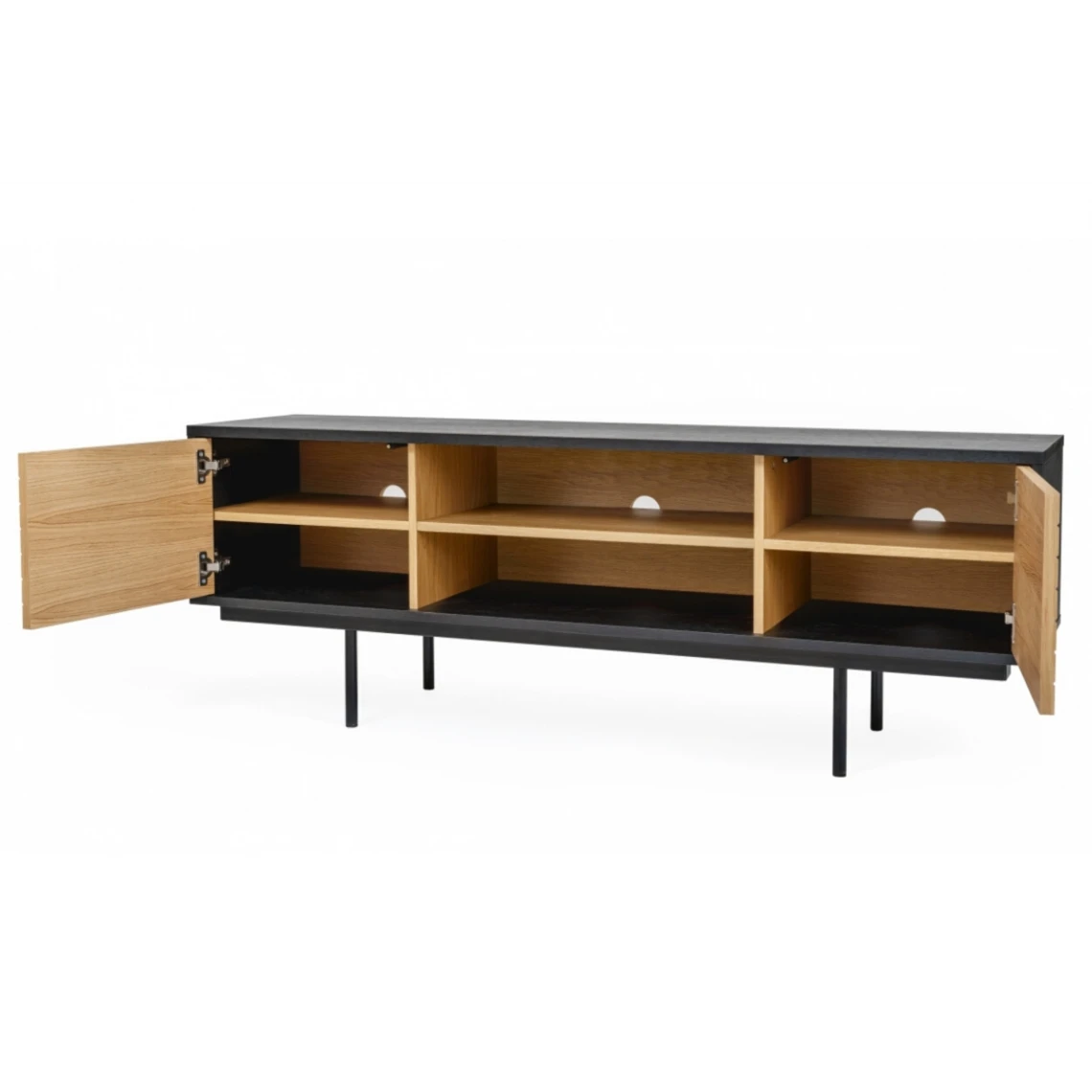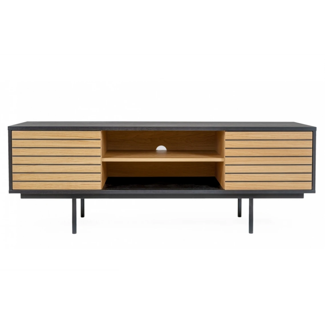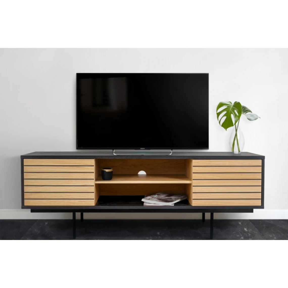Côté façade, les 2 portes du meubles tv sont en MDF noir massif, recouvert de bandes de placage chêne verni à l’effet graphique très affirmé et contemporain. Pas de poignées ? C’est normal, les portes sont équipées d’un système “push to open”. Il suffit donc de les pousser pour les ouvrir. Les pieds sont des tubes d’acier mesurant 20 cm de haut, peints avec une peinture en epoxy noire… Pour un résultat ultra chic et design.