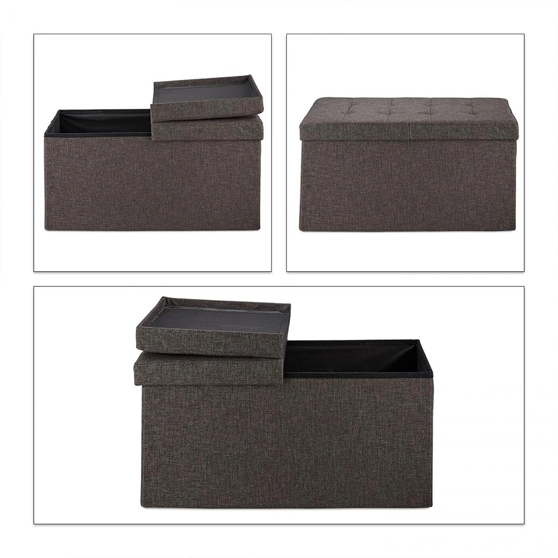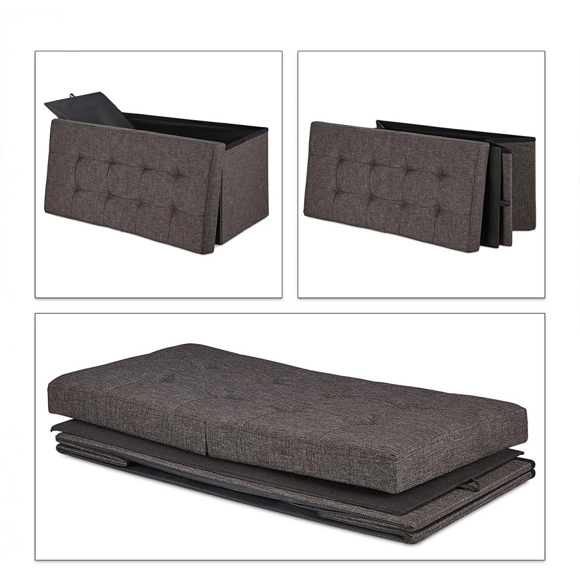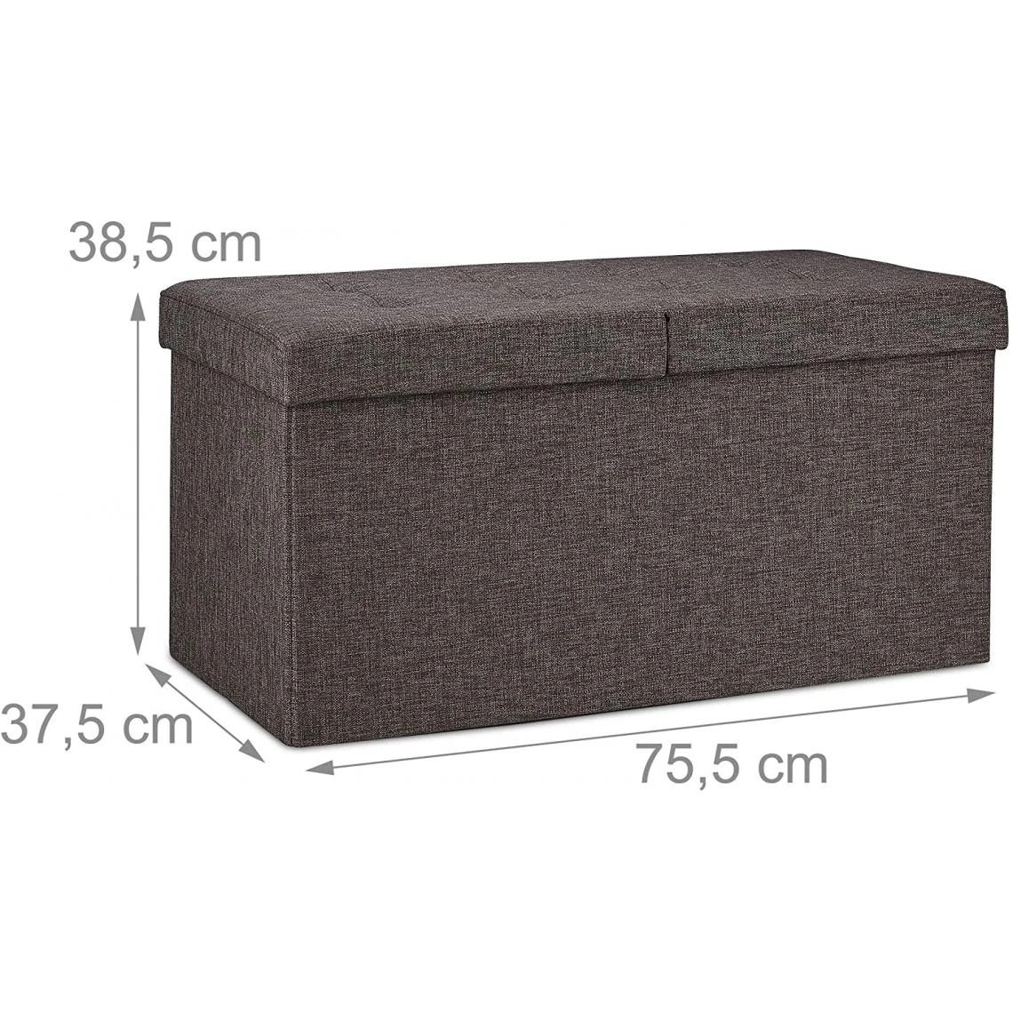Banquette avec un couvercle pliable Couvercle peut être rabattu à moitié Ranger couvertures, couvertures, jouets et autres Design avec une surface d’assise pour 2 extra douce Si nécessaire le banc est rapidement pliable Pour salon, chambres d’enfants et entrée Contenu 1x Banc pliable Banquette range-chaussures en un clin d’œil Dimensions H x L x P: env. 38,5 x 75,5 x 37,5 cm Dimensions intérieures H x L x P: env. 34 x 73 x 34 cm Volume: env. 84 L Avec charge 300 kg Pèse env. 5,7 kg En tissu, mousse et MDF Différents designs au choix