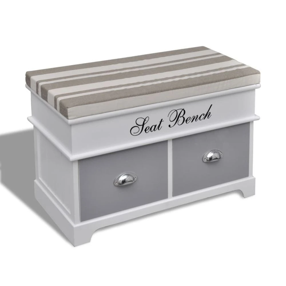 Ce banc pourvu de trois cagettes et deux tiroirs touve sa place dans une entrée, le salon ou dans la chambre à coucher grâce à son apparence exquise. Ce type de banc vous permet de vous asseoir pour chausser avant de sortir.Deux tiroirs en dessous du siège offrent un large espace de rangement, vous pouvez y ranger les chaussures, sacs, livres, jouets et d’autres objets. Son cadre est en bois de haute qualité et ses paniers durables ont été fait à partir de matériau écologique (maïs), ce qui est conçu pour des années d’utilisation.Vous pouvez trouver un bon équilibre entre le rôle utilitaire et la fonction decorative de ce banc. Couleur: blanc Matériau du cadre: bois de paulownia et contreplaqué Dimensions totales: 69 x 34 x 45 cm Dimensions du tiroir: 31 x 32 x 20 cm Matériel: Polyester: 100%