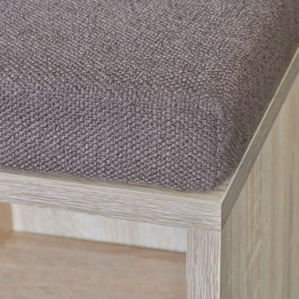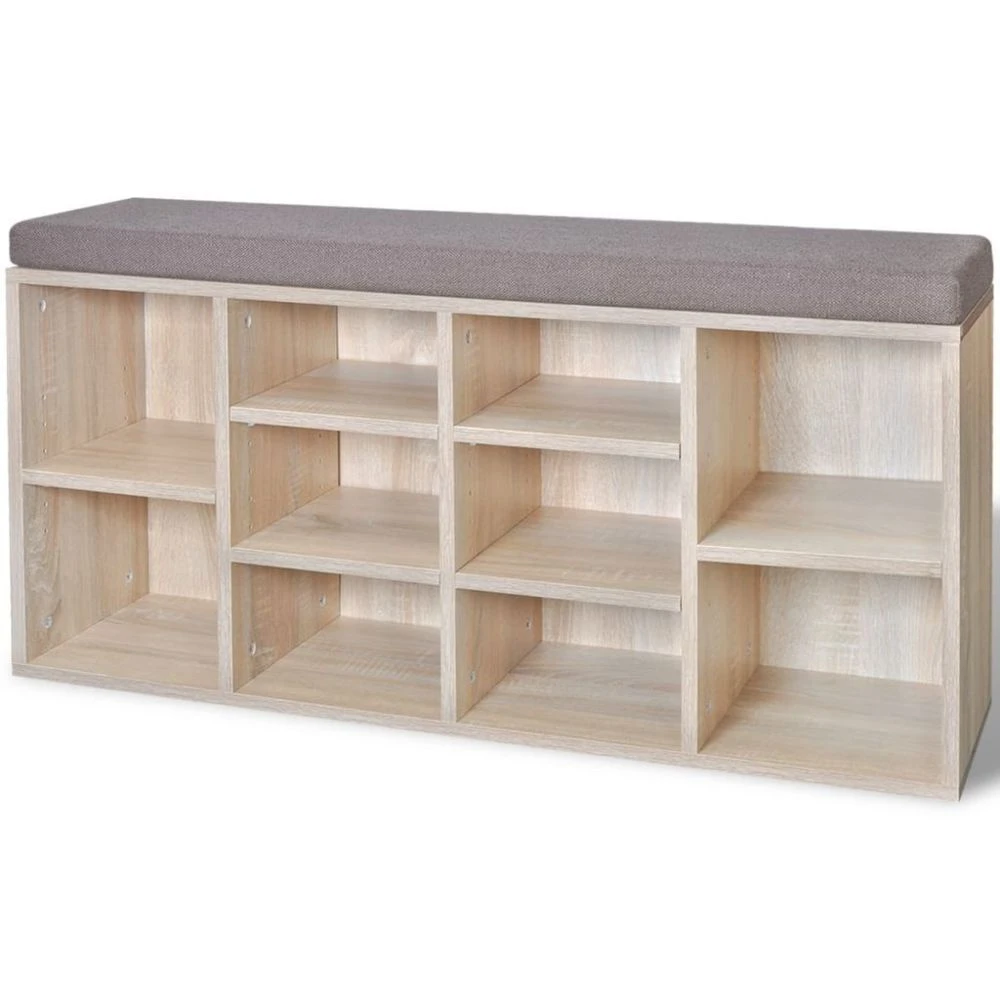 Ce banc de rangement de chaussures, avec un design simple mais élégant, sera un excellent ajout à votre décor. Le banc dispose d’un large espace pour stocker jusqu’à 10 paires de chaussures. Le dessus est recouvert en tissu rembourré de mousse épaisse, de sorte que vous puissiez vous asseoir confortablement tout en ôtant ou mettant vos chaussures. Fabriqué en matériaux de haute qualité, le banc de rangement de chaussure est très solide et durable. La livraison comprend également les accessoires de montage. Facile à assembler. Couleur : Chêne (cadre) + brun (siège) Matériau du cadre : Aggloméré mélaminé Dimensions générales : 103 x 30 x 48 cm (L x P x H) 10 compartiments Matériel: Coton: 30%, Lin: 70%