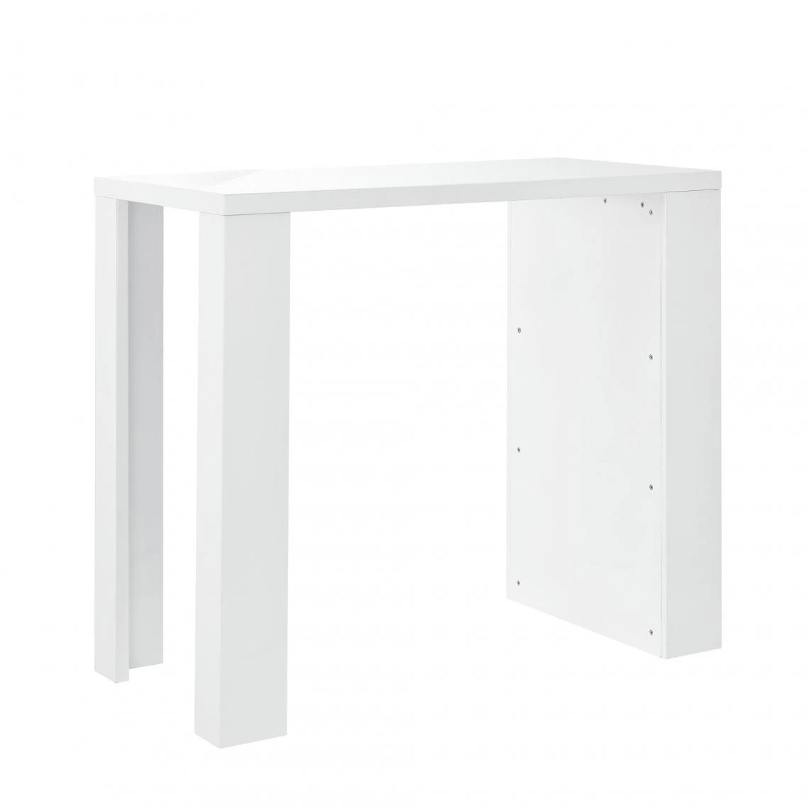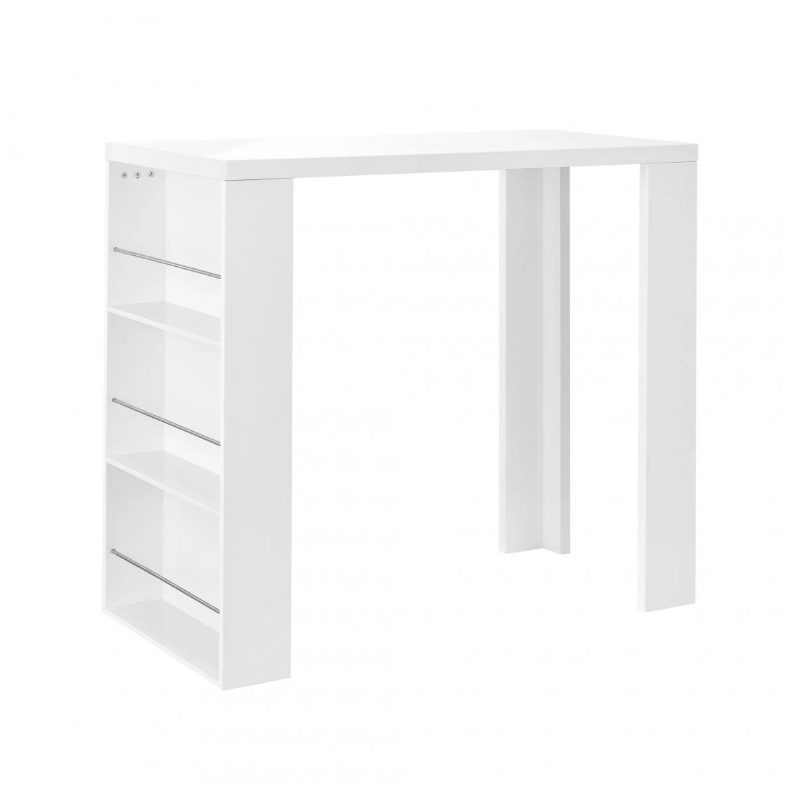 Table de bar élégante avec compartiments de rangement Avez-vous déjà imaginé le moment de détente avec votre partenaire où vous prenez un verre de vin ou cocktail ensemble comme dans un bar mais en restant chez vous ? Cette table de bar dotée de 3 étagères de rangement vous permettra de créer cette ambiance. Grâce à sa hauteur idéale, vous pouvez profitez de cette table sans vous baisser lors des préparations des plats. : – table de bar avec 3 compartiments – en panneaux de particules – construction solide avec design très esthétique – nettoyage facile – montage simple et rapide Couleur : blanc mat Dimensions : – totales (longueur x largeur x hauteur) : 117 x 57 x 106,5 cm – compartiment (longueur x largeur x hauteur) : 54 x 13,8 x 32,8 cm Contenu de la livraison : 1 x table de bar avec notice de montage