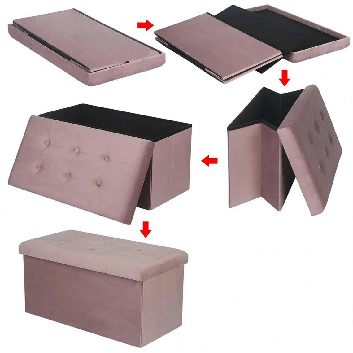 Caractéristiques Espace de rangement pratique pour les petites choses, comme les livres, les jouets, les télécommandes, etc. Les sièges en velours bien rembourrés vous offrent une expérience d’assise très confortable. Le cadre robuste en panneau de fibres MDF (classe E1) est très stable et peut supporter un maximum de 150 kg. Tabouret pliable, facile à plier et à ranger pour économiser de l’espace. Montage et démontage facile et rapide. Fabrication stable et de haute qualité. Spécifications techniques Matière assise : velours Matériau intérieur : MDF (classe E1) Dimensions : environ 76 × 37,5 × 38 cm (L x l x H) Capacité : 80 litres Poids : 5,8 kg (net) Charge maximale : 150kg Couleur : gris, rose Contenu de la livraison : 1 x tabouret Veuillez noter Les objets décoratifs ne sont pas inclus dans la livraison. Les couleurs affichées peuvent différer des couleurs réelles en fonction des paramètres du moniteur et de l’écran.