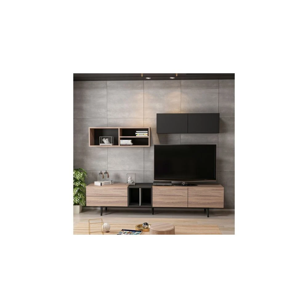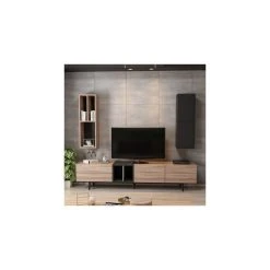 Ce meuble TV, élégant et fonctionnel, c’est la solution idéale pour la télévision et tous les appareils numériques. Parfait pour garder les accessoires en ordre et montrer objet de décoration. Grâce à sa conception, il est idéal pour le salon. Kit de montage inclus, facile à nettoyer, facile à assembler. Couleur: Noir, Bois | Dimensions: 195x37x45 cm | Matériel: Panneau de Particules | Poids du produit: 54,85 Kg | Poids supporté: Meuble TV 20 Kg, Chaque étagère 2 Kg | Poids de l’emballage: 55,35 Kg | Nombre de boîtes: 3 | Dimensions des boites: 145x39xH11 cm – 96x31xH17 cm – 68x34xH10 cm