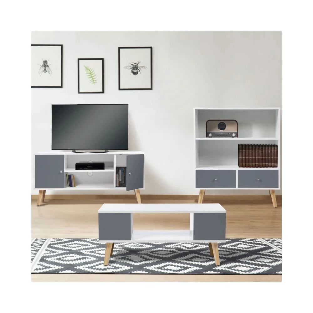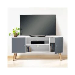 La touche scandinave prend place chez vous avec le meuble TV EFFIE en bois blanc et gris !Les lignes épurées nordiques de ce meuble TV créeront une atmosphère chaleureuse et cosy dans votre salon !Ce superbe meuble de télévision, dont les finitions sont soignées, est en panneau de particules (MDF épaisseur 1,5 cm).Ses 4 pieds en pin lui apportent stabilité et robustesse. Ses 2 placards aux portes grises (dimensions : L. 29,2 x P. 40 x H. 34 cm) et ses 2 étagères centrales offrent des espaces de rangement (dimensions : L. 51,5 x P. 40 x H. 34 cm).Posez votre télévision sur ce meuble, reliez vos périphériques tout en cachant vos câbles derrière le meuble grâce au trou passe-câbles intégré et prenez place confortablement dans votre canapé !Dimensions totales : L. 113 cm x l. 39,5 cm x H. 53,5 cmDimensions des pieds : H. 16,5 cm – Diamètre 3 cmDiamètre trou passe-câble : 5 cmModèle disponible en différents coloris sur notre boutique en ligne :- Meuble TV EFFIE scandinave bois blanc- Meuble TV EFFIE scandinave bois blanc et gris- Meuble TV EFFIE scandinave bois blanc et imitation hêtreRetrouvez toute notre collection de meubles Effie assortis sur notre boutique en ligne :- Table basse EFFIE- Bibliothèque EFFIE