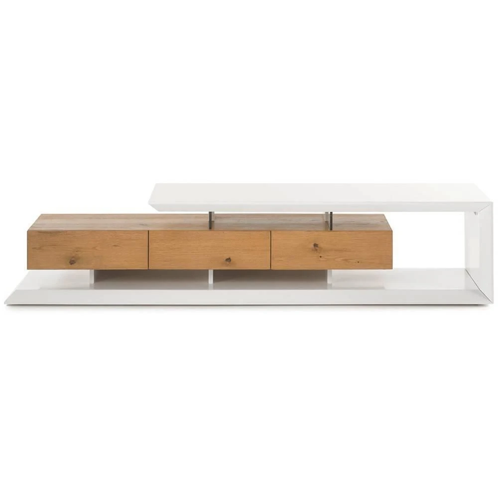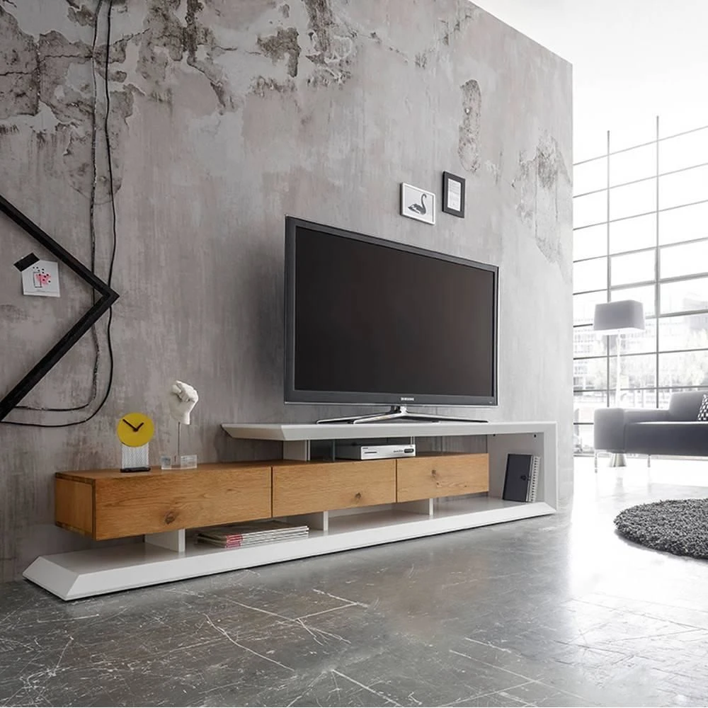 Points forts Inside 75 Meuble TV design EMERAINVILLE finition laquée blanc mat 3 tiroirs façade chêne noueux