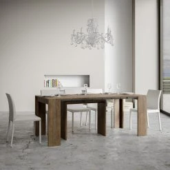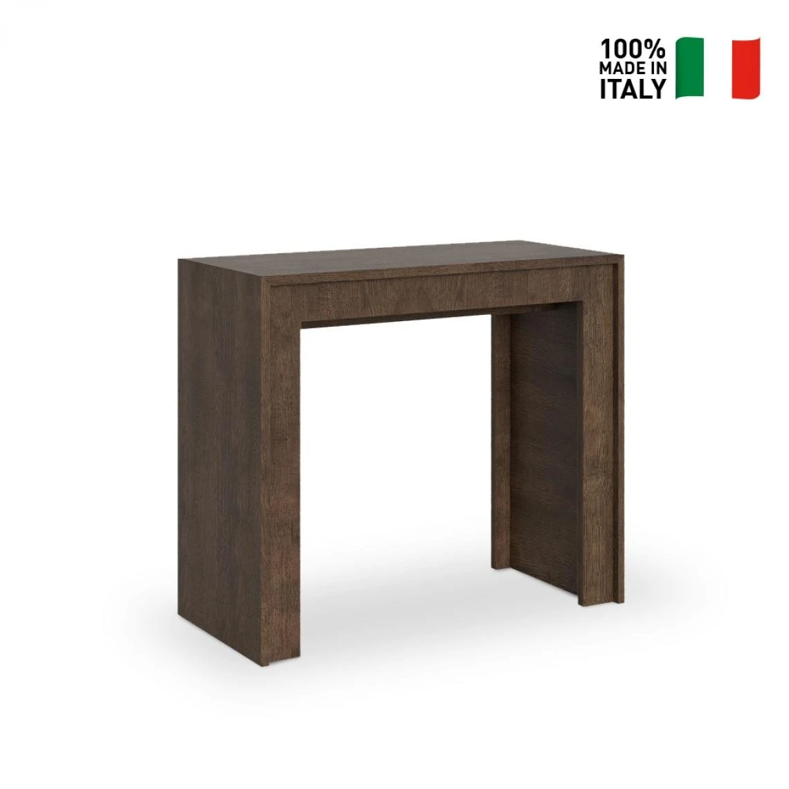 Lorsqu’il est fermé, son plan de travail est parfait pour être utilisé comme vide-poche pratique à l’entrée, comme bureau pour étudier, travailler au bureau ou pour décorer d’autres pièces de la maison ; en ajoutant des rallonges fournies sur les guides télescopiques, vous pouvez obtenir une table à manger plus longue ou plus courte en fonction du besoin du moment ou de l’espace disponible. L’innovant support pivotant central rétractable garantit une stabilité maximale et, étant capable d’assumer différentes positions, il ne gênera jamais les convives qui pourront toujours s’asseoir à table dans un confort maximal. Extrêmement solide et robuste, la console extensible Mia Noix est construite uniquement avec des matériaux de qualité 100% Made in Italy : le plateau, ainsi que les pieds de support et les 5 rallonges, sont fabriqués avec des panneaux de mélamine, avec l’ajout d’une couche de protection en mélamine qui rend la surface lisse au toucher, mais aussi parfaitement résistante à un usage quotidien ainsi que durable dans le temps.