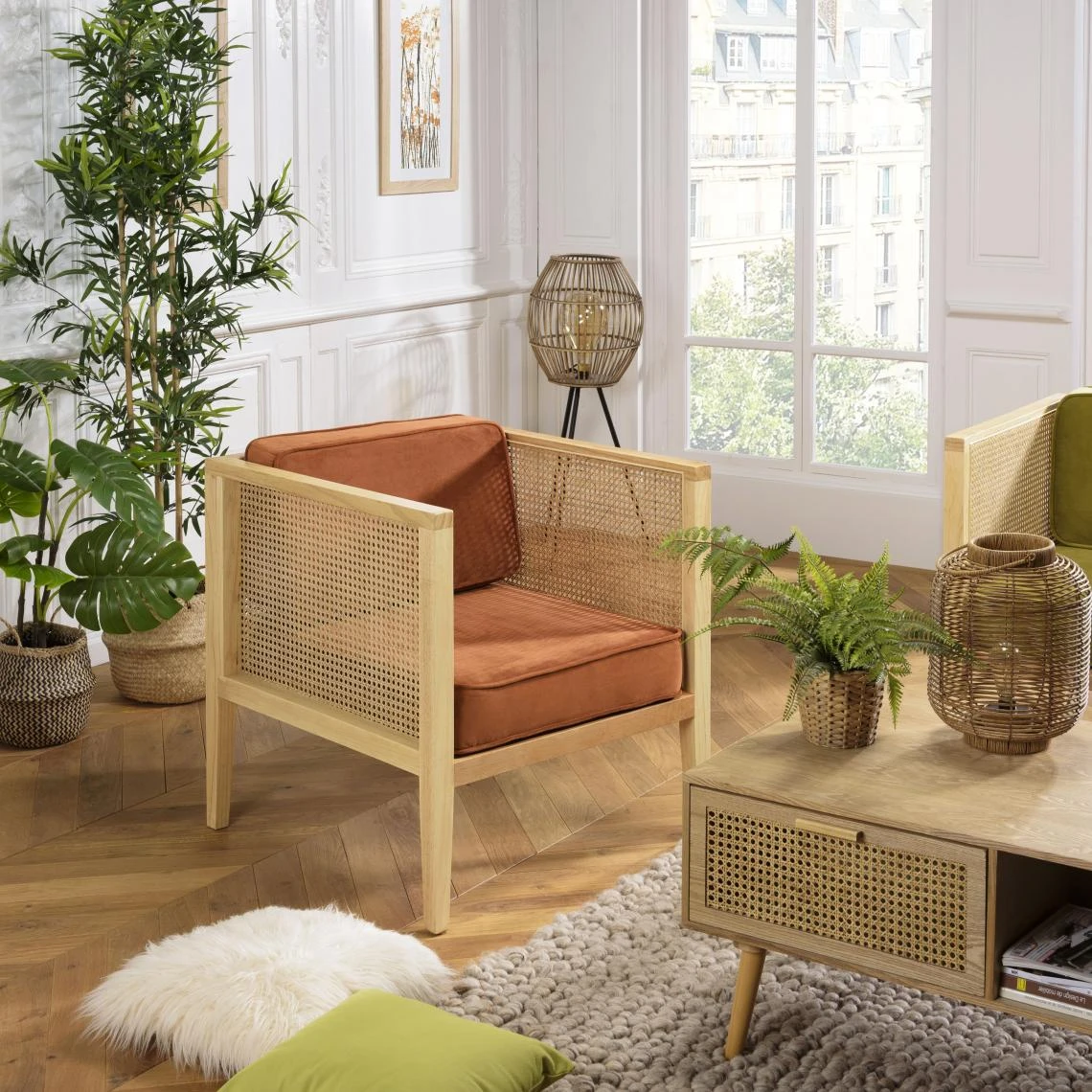 Points forts MACABANE Fauteuil cannage assise amovible velours orange