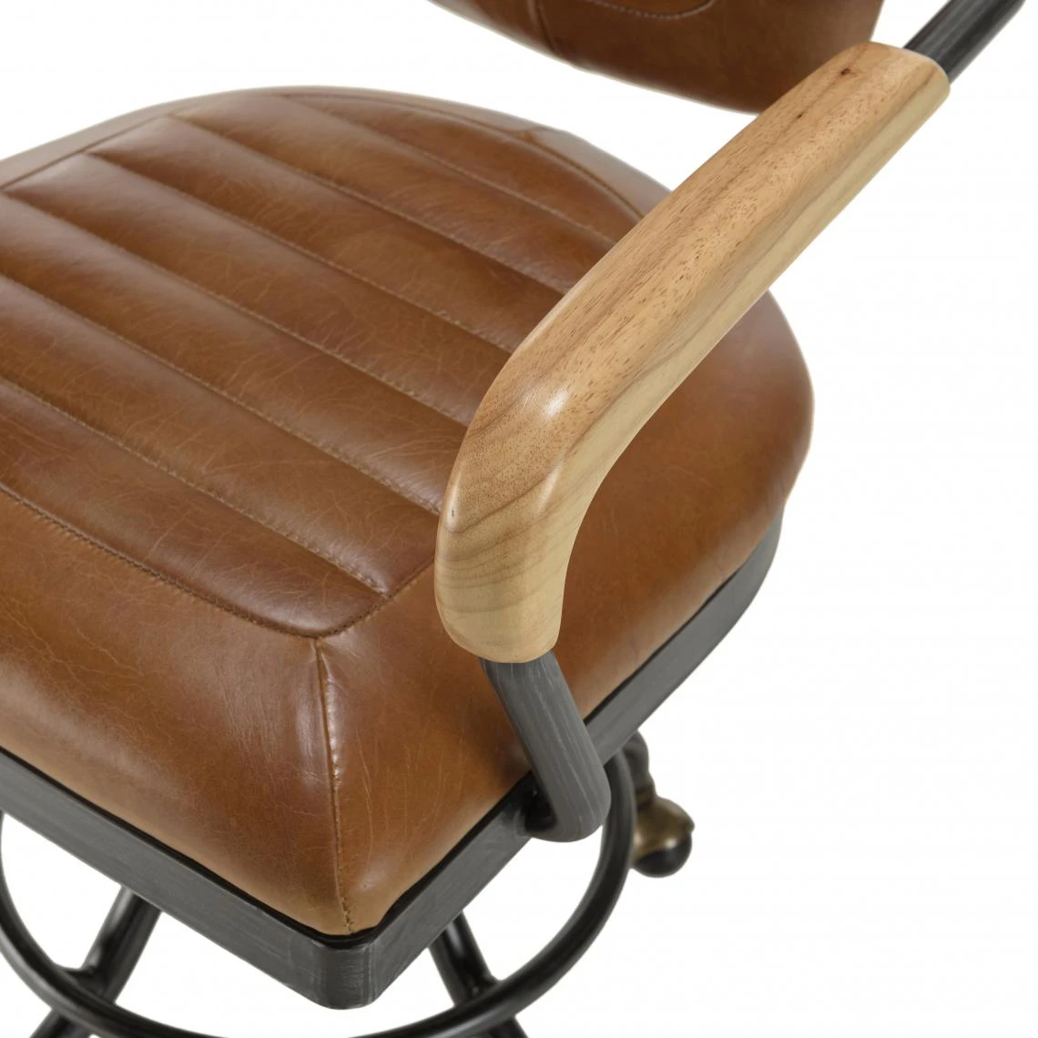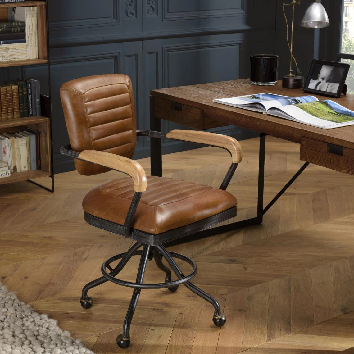 Fauteuil DESK vintage cuir marron et métal noir à roulettes accoudoirs en bois.