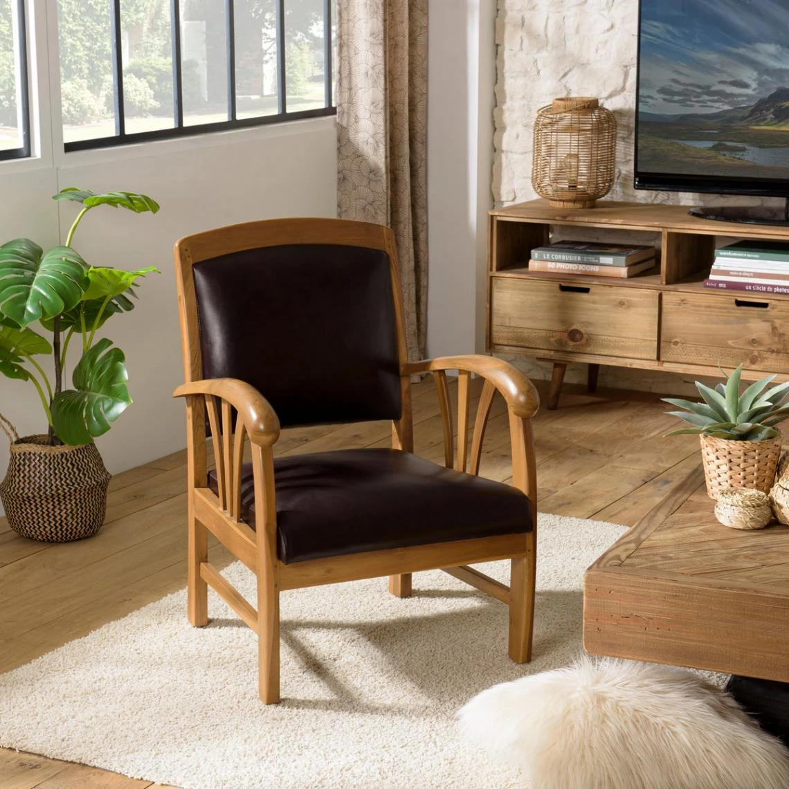 Points forts MACABANE Fauteuil en teck et cuir style colonial – Marron