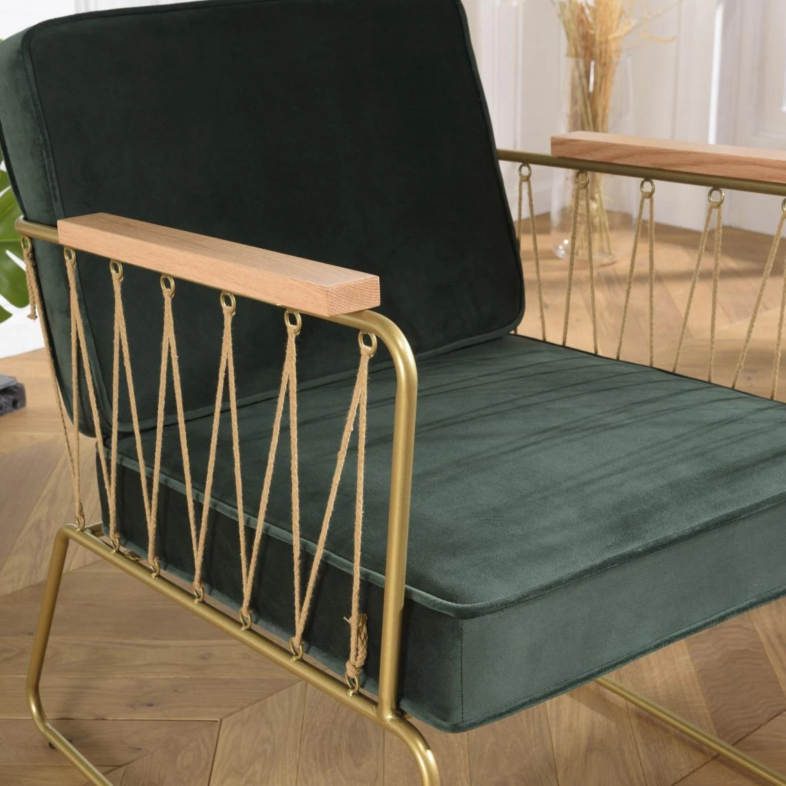 Points forts MACABANE Fauteuil velours vert foncé pieds métal doré accoudoir cordage