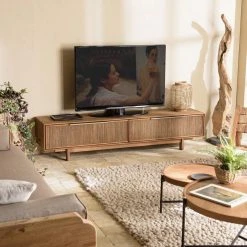 Égayez votre salon avec ce Meuble TV 2 tiroirs en bois teck recyclé et tissage naturel. De style ethnique, elle séduit avec sa structure en bois et sa façade en coco très exotique. Pratique, il vous sera d’une grande aide pour vos rangements grâce à ses deux tiroirs.