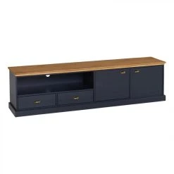 Porte :2 . Socle :pin massif – gris antracite laqué, finition matte. . Portes :pin massif – gris antracite laqué, finition matte. . Tiroir :2 . Plateau :pin massif – ciré iryna, finition matte. . Poignées :métalliques couleur bronze. . Structure :pin massif – gris antracite laqué, finition matte. . Charge maxi TV :50 kg. . A monter soi-même. . Dimensions en cm :L. 180 – H. 47 – P. 38 cm. . Taille diagonale max écran (cm/pouce) :75 (215.9 cm). .