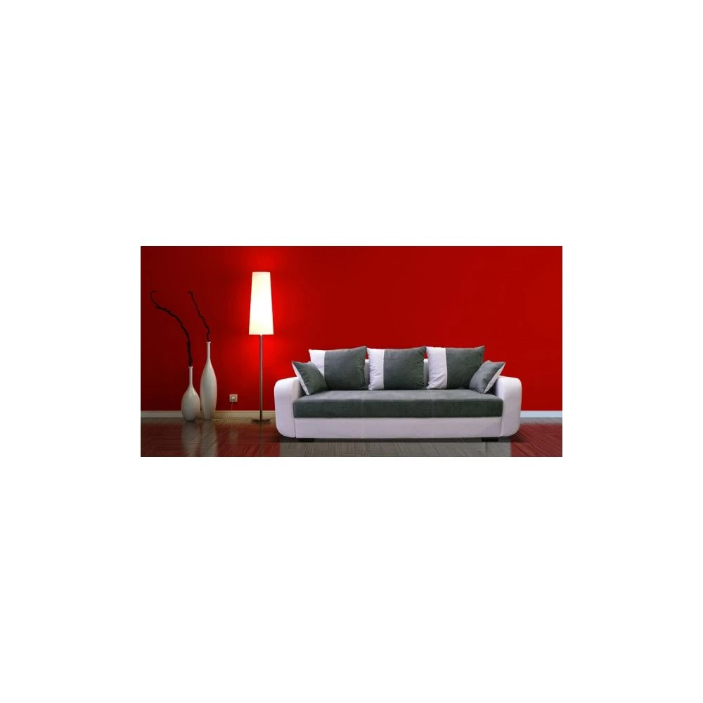 Canapé 3 places convertible en lit.Dispose d’un coffre de rangement sous l’assise.Dimensions :3 places : 232 x 92 x 95 cmFonction couchage : 190 x 140 cmMatière : Assise en tissu microfibre gris et contour en simili cuir blanc.Dossier : Coussins remplis de mousse polyurethaneCadre : Bois (pin, Hetre), panneaux agglomérés.Assise : Ressort Nossag, ressort bonnel, mousse polyurethane 30kgPied : Chrome