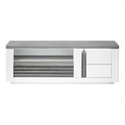 Ce meuble TV avec rangements est un modèle design qui se distingue par ses nombreux emplacements de stockage. Idéal pour investir un intérieur moderne, ce meuble TV de L. 150 x H. 52 x P. 42 cm présente de belles finitions laquées blanches et un plateau imitation chêne gris. Fin et solide, il peut accueillir un écran jusqu’à 60 pouces.