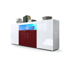 Buffet avec 2 portes, 3 tiroirs et un compartiment ouvertCorps (les panneaux latéraux et le plateau du dessus) en Blanc haute brillanceFaçades en Blanc et Bordeaux haute brillance en MDF et Avola-AnthraciteLa bordure est aussi en Blanc haute brillance en MDFLed inclusDimensions du buffet en cm (HxLxP) : 72 x 167 x 35Livré démonté Garantie 1 an