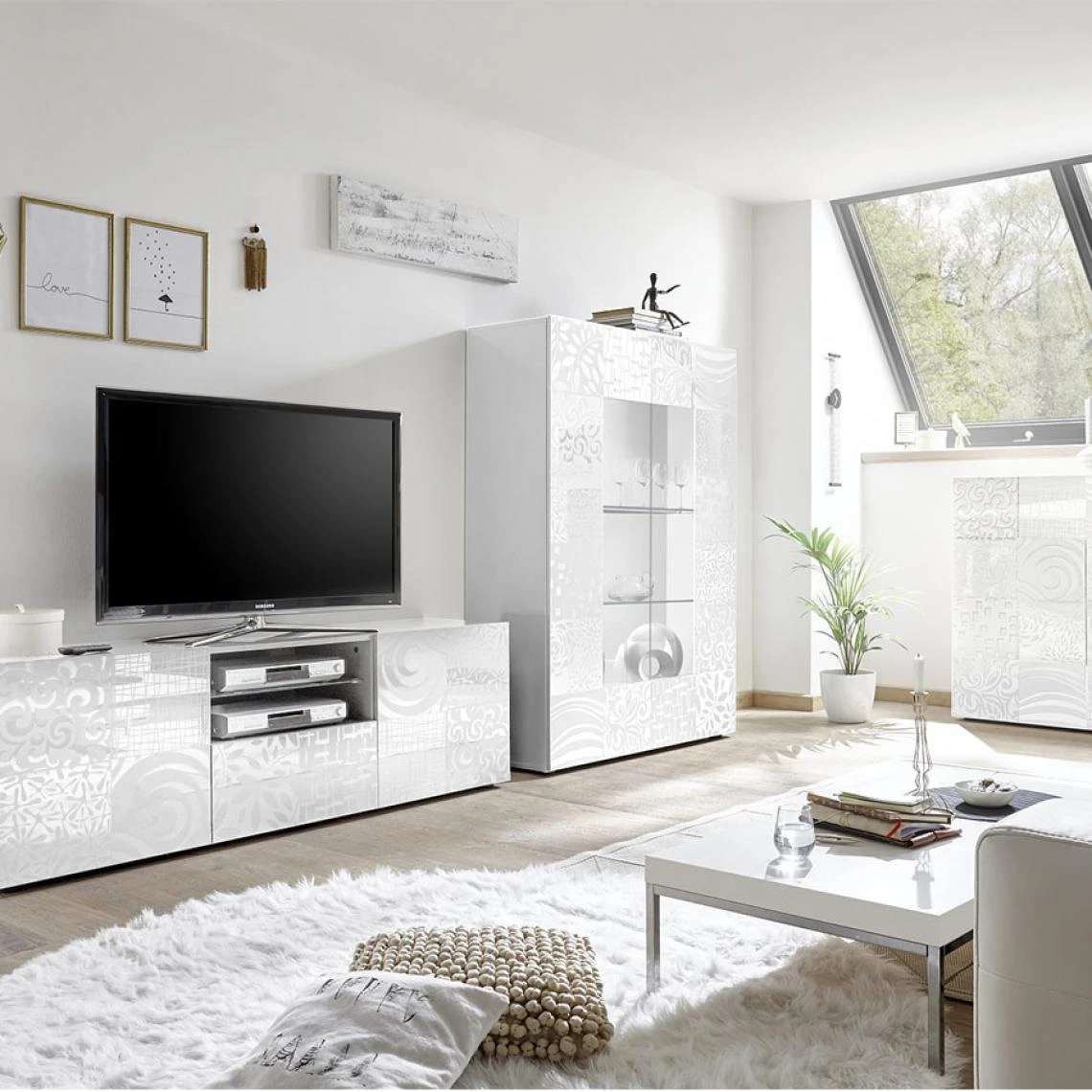 Ce Meuble tv blanc laqué design, pour une brillance absolue dans votre salon.Faites entrer la sobriété et l’élégance dans votre salon avec ce meuble TV sérigraphié. Ses lignes décoratives lisses; empêche la poussière de s’y déposer. Avec sa laque high gloss, traitée anti-rayure anti jaunissement, celle-ci protège votre meuble tv blanc, contre les agressions du soleil et les griffures. Pour moderniser au maximum votre salon, choisissez une table basse blanche ou une table basse en verre. Avec un ou sans l’éclairage, le banc TV blanc va sublimer votre intérieur.