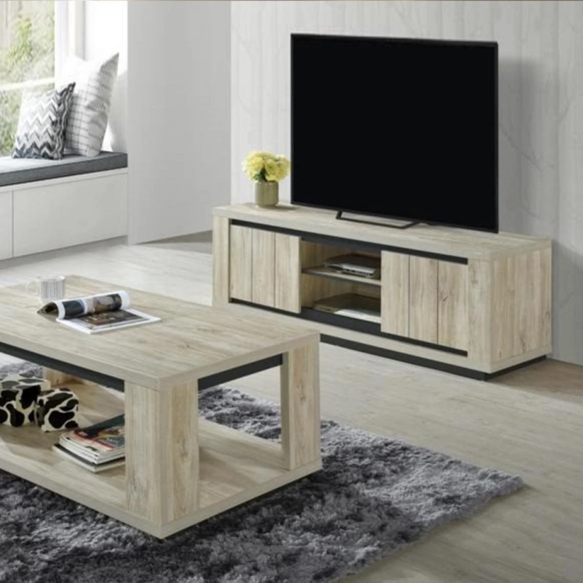 Meuble télévision en panneaux de particules recouvert d’un papier décor bois clair.