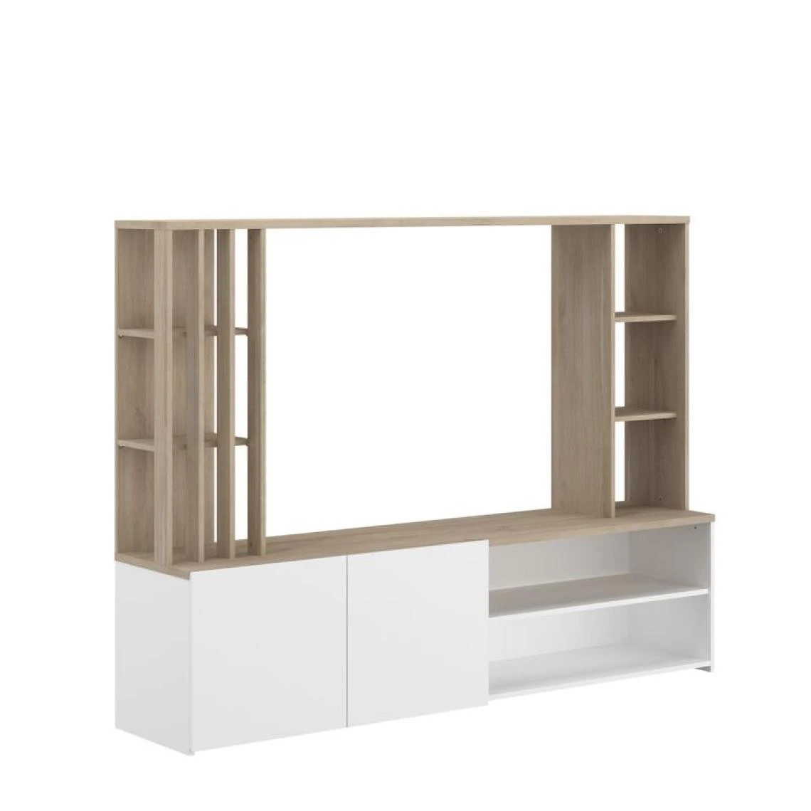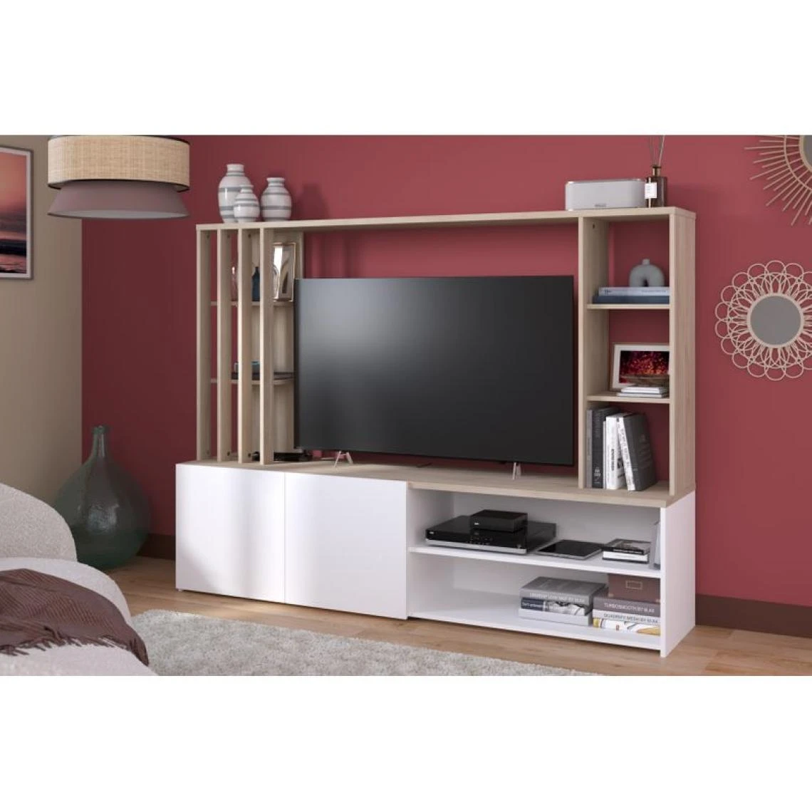 Niche :2 . Portes :2 . Teinte :Chêne et blanc . Garantie :2 ans . Etagères :5 étagères (ep 15mm) . Structure :Structure en panneaux de particules et MDF . A monter soi-mêmeOui . Dimensions en cm : L.184 x H.138 x l.41 cm . Taille diagonale max écran (cm/pouce) :50 pouces . Dispo pcs détachées donnée fournisseur :NC .