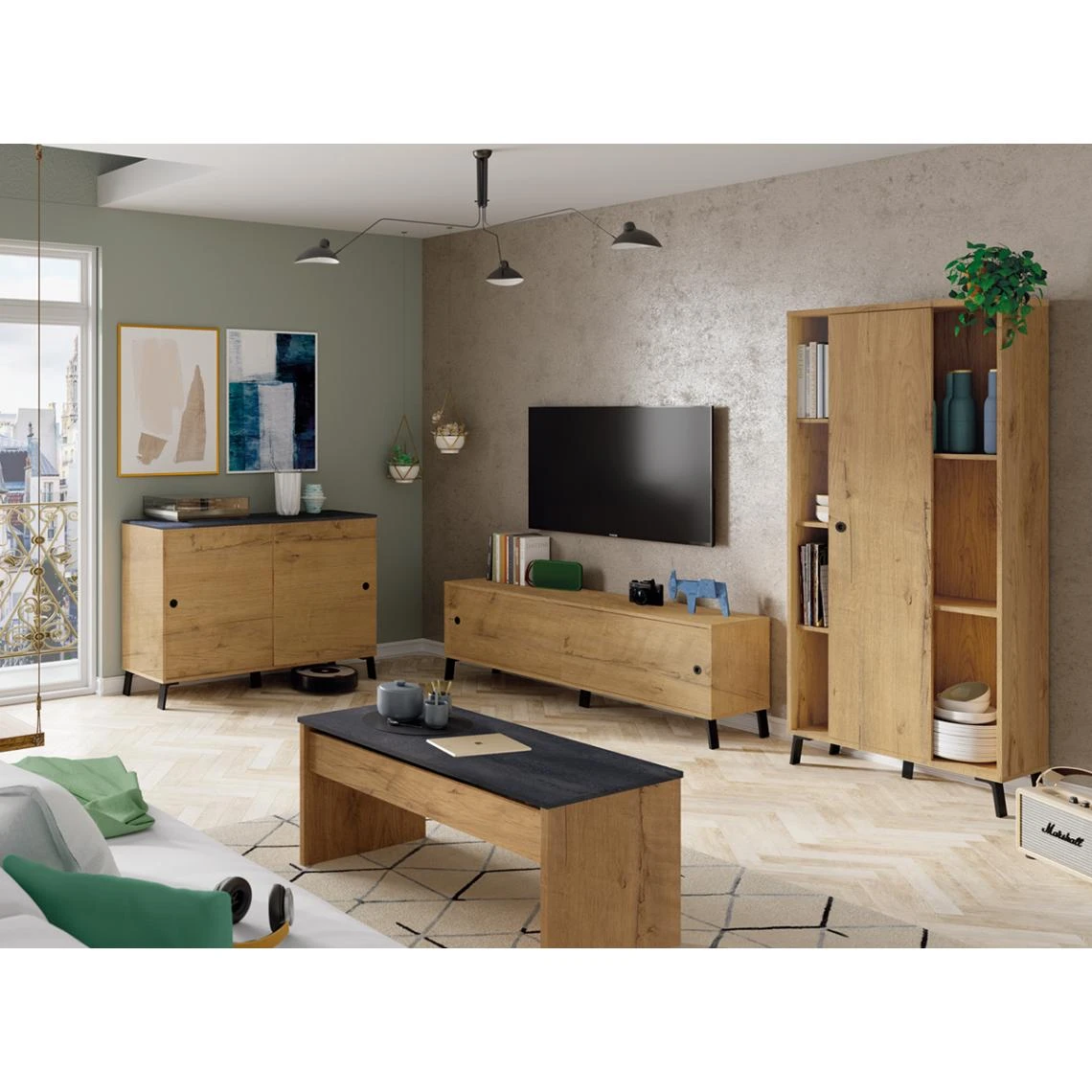 Points forts Pegane Ensemble de séjour coloris chêne doré ( meuble TV + Buffet + Bibliothèque + Table basse)