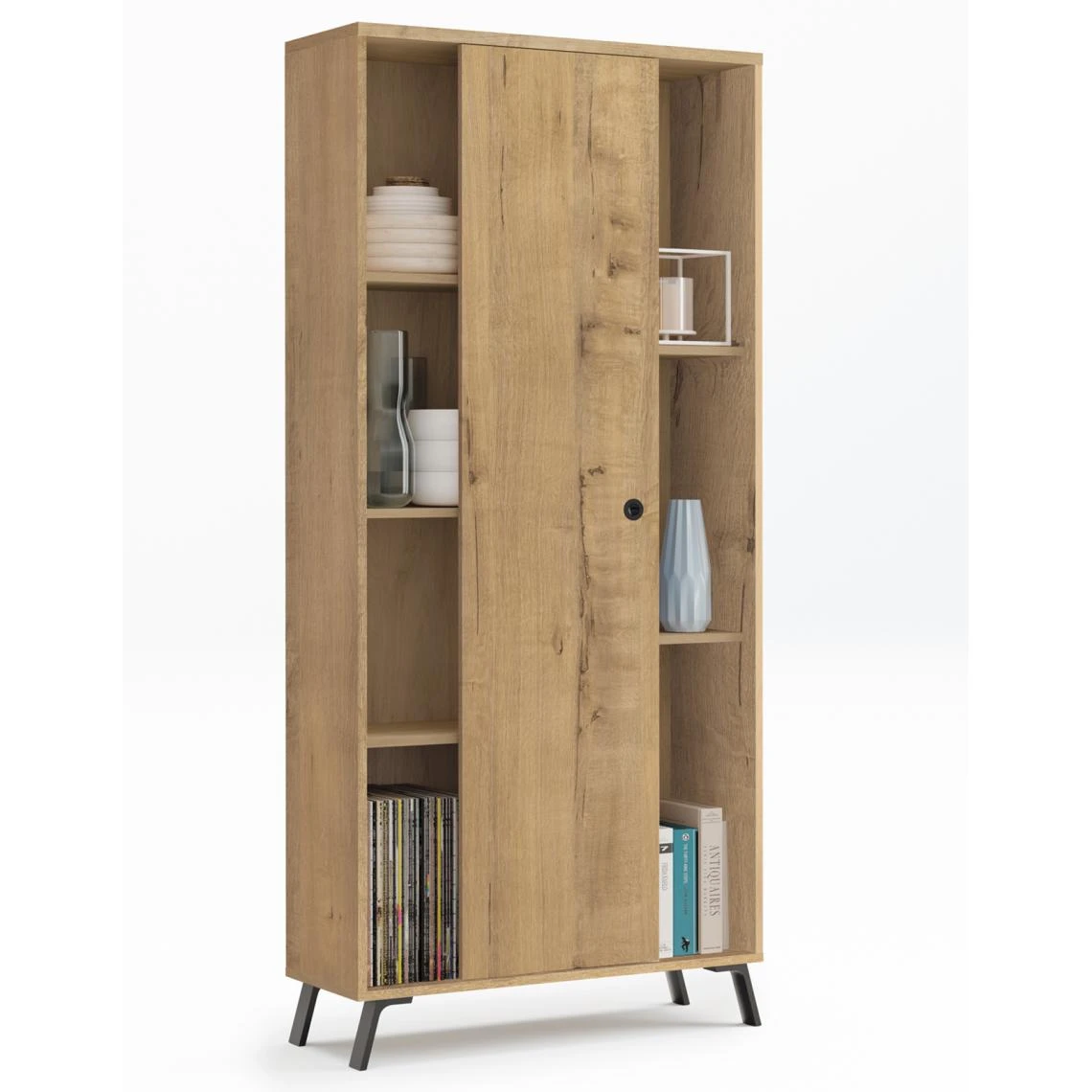 – Bibliothèque étagère, en panneaux de particules et mélamine haute densité coloris chêne doré, avec 1 porte coulissante avec 4 niches à gauche et 3 niches à droite. Poignée et pieds en plastique ABS noir.