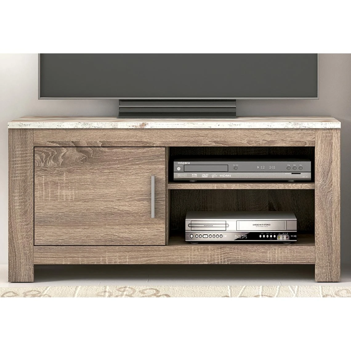 Meuble TV coloris Chêne truffé et blanc vieilli, en panneau de particule mélaminé, avec 1 porte et 2 étagères.
