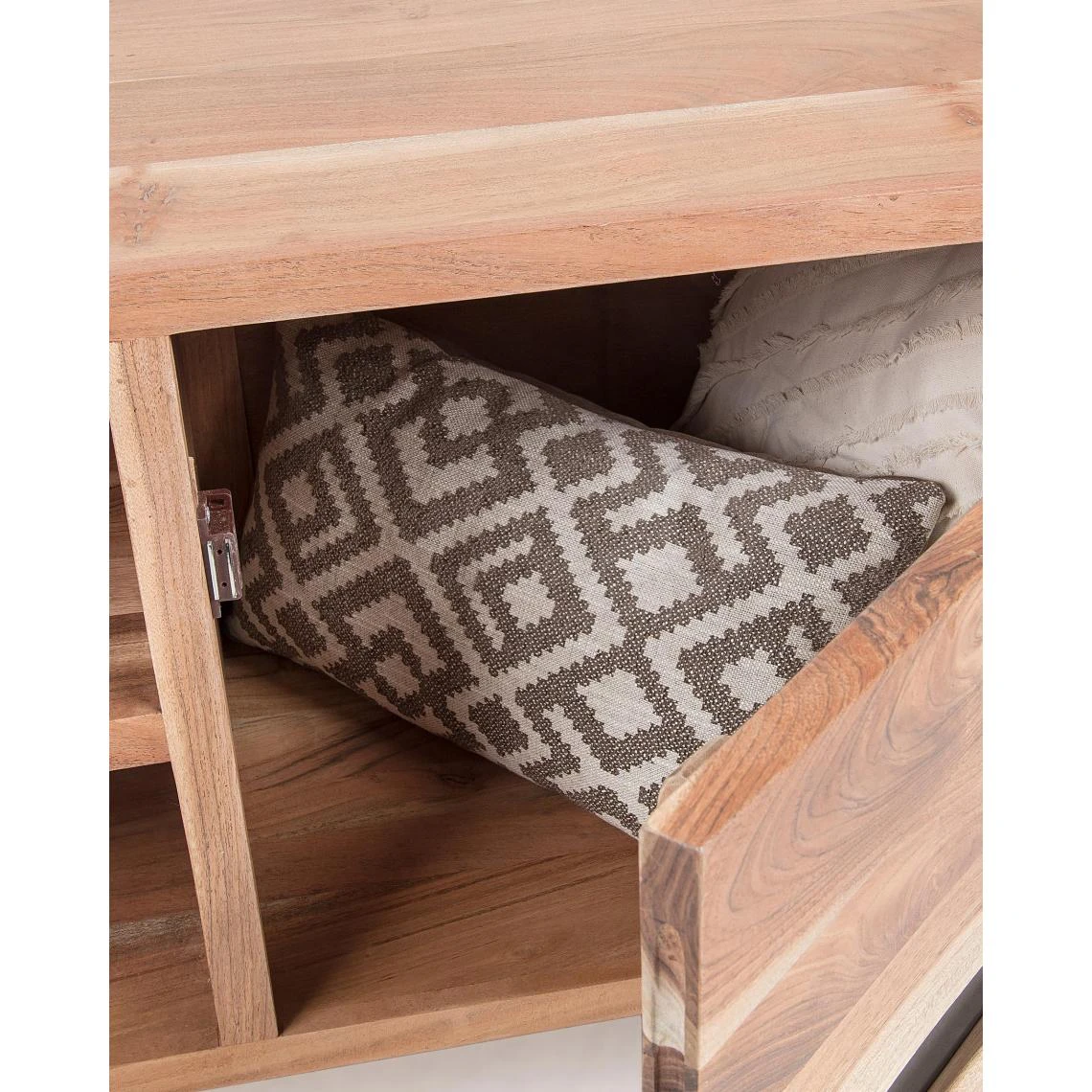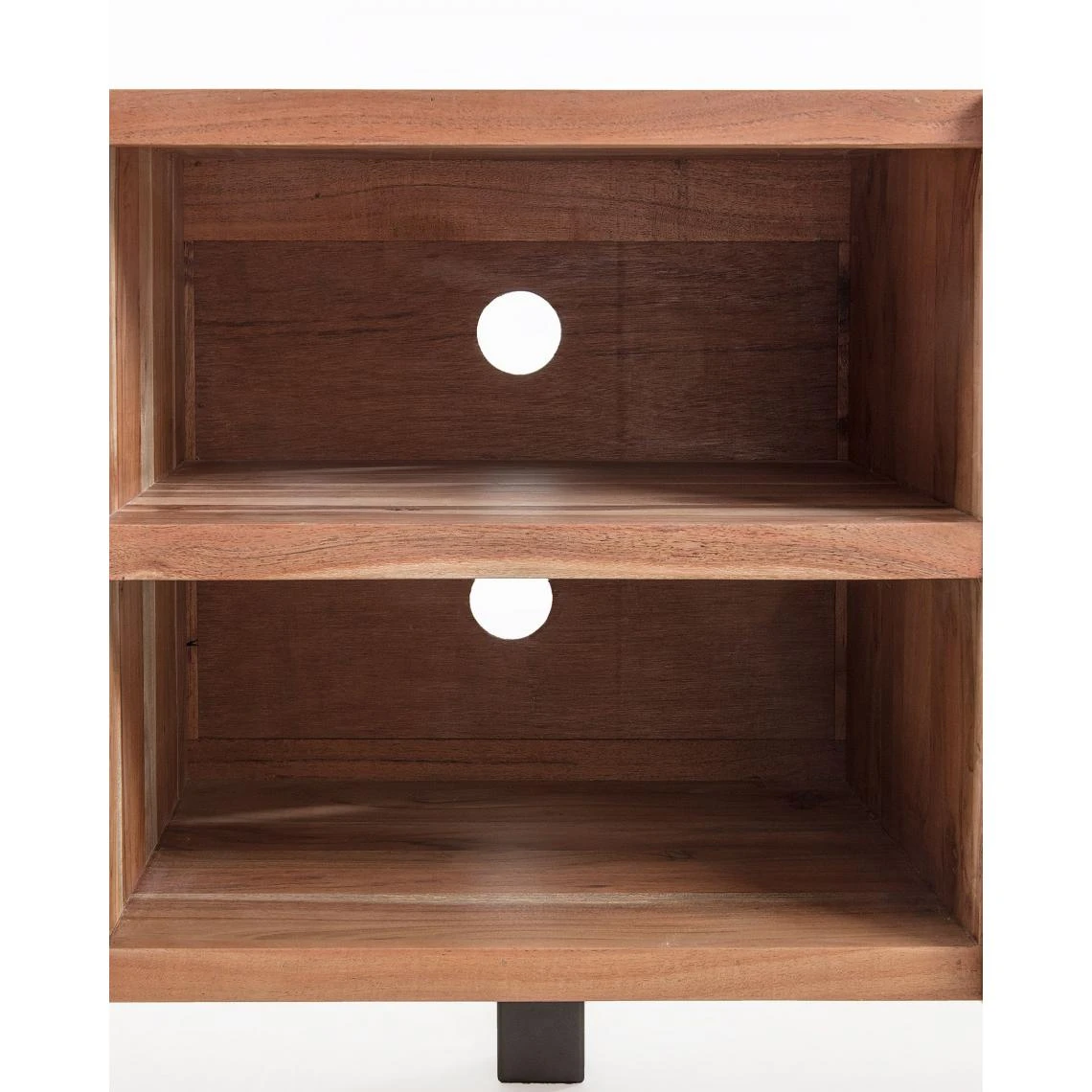 Meuble TV en bois massif d’acacia avec des détails sur les portes en métal. Ses pieds sont en métal. Dimensions: longueur 160 x profondeur 43 x hauteur 65 cm Matériaux : bois d’acacia, acier