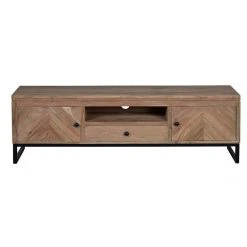 Meuble TV avec 2 portes et 1 tiroir en bois d’acacia et socle en métal. Livré monté. Dimensions : longueur 160 x profondeur 40 x hauteur 50 cm