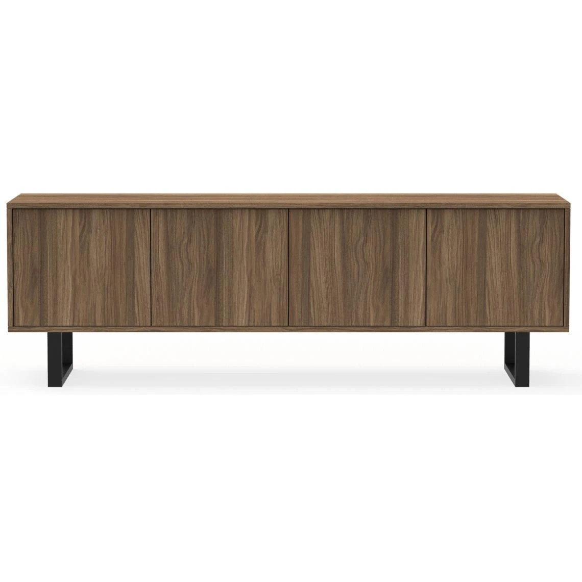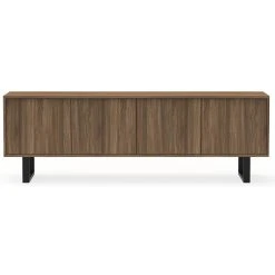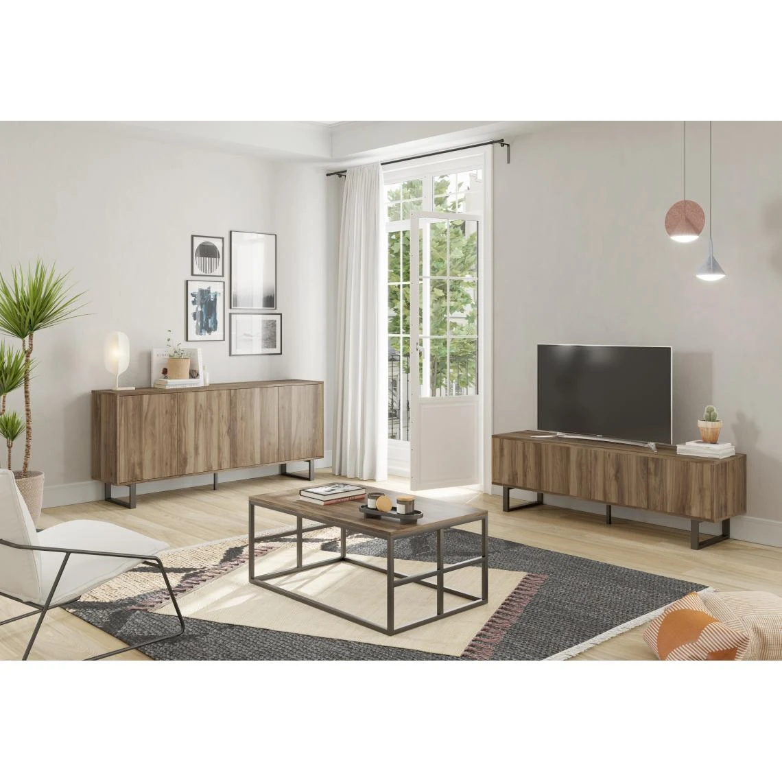 Ce Meuble TV est équipé de 4 portes qui cachent ses niches de rangement, la pièce idéale pour ranger vos objets et accueillir votre téléviseur et profiter de vos appareils multimédias. Son design en bois mélaminé effet noyer et sa couleur en bois naturel clair donneront une touche de luminosité à votre décoration.