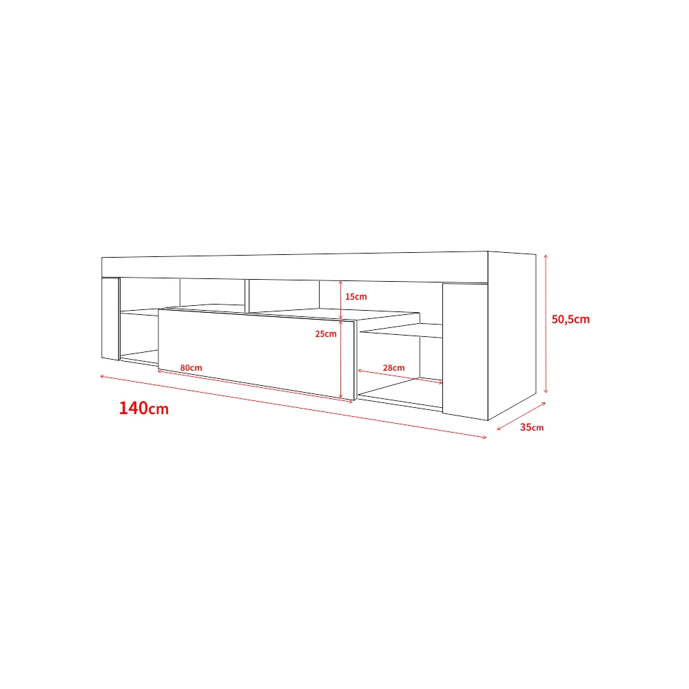 Voici meuble TV Hugo : la solution idéale pour votre intérieur ! Grâce à deux niches ouvertes, vous ordonnerez et bien exposerez votre équipement multimédia. Désormais, tout sera toujours à portée de la main. De plus, le meuble TV Hugo est équipé d’un compartiment fermé pour que la poussière ne s’accumule pas sur vos accessoires télé. L’éclairage LED ajoutera un look moderne à votre salon et mettra en valeur vos décos.