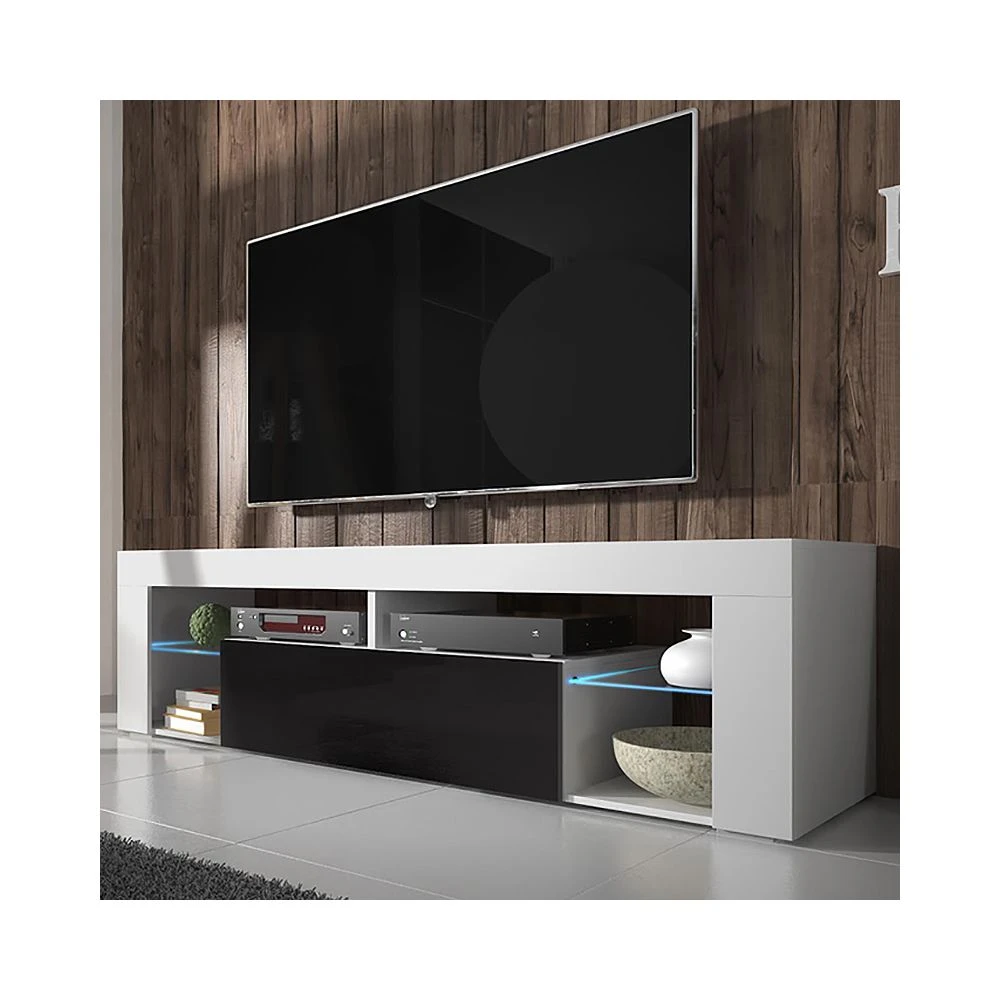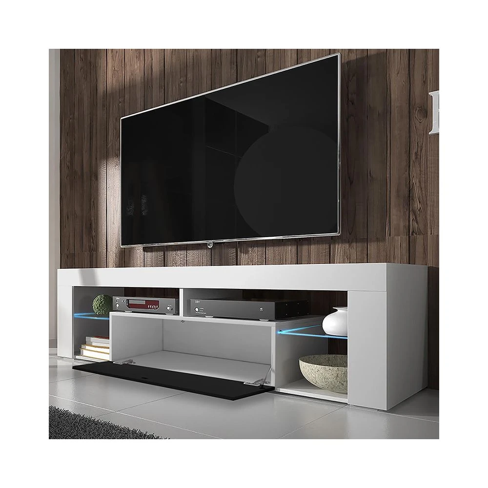 Meuble TV / Meuble de salon HUGO – 140 cm – blanc mat / noir brillant – avec LED – style moderne – tablette en verre
