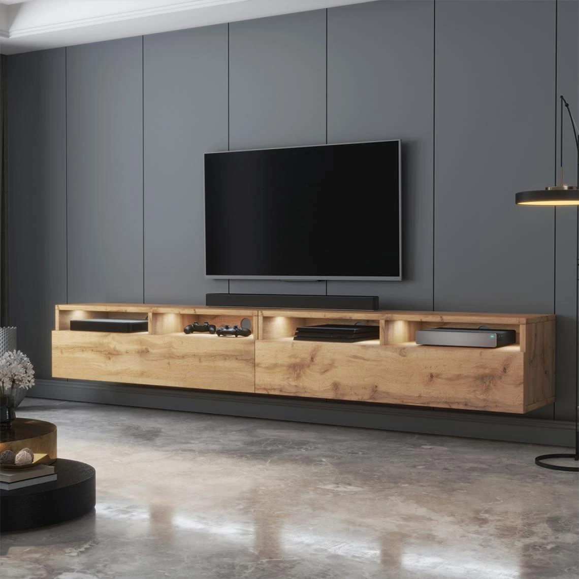 Points forts Selsey Meuble TV – REDNAW – 200 cm – chêne wotan – avec LED