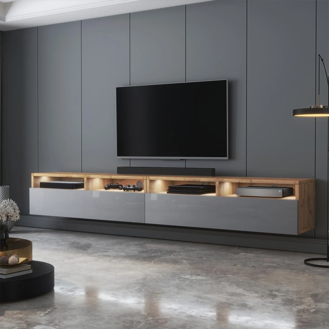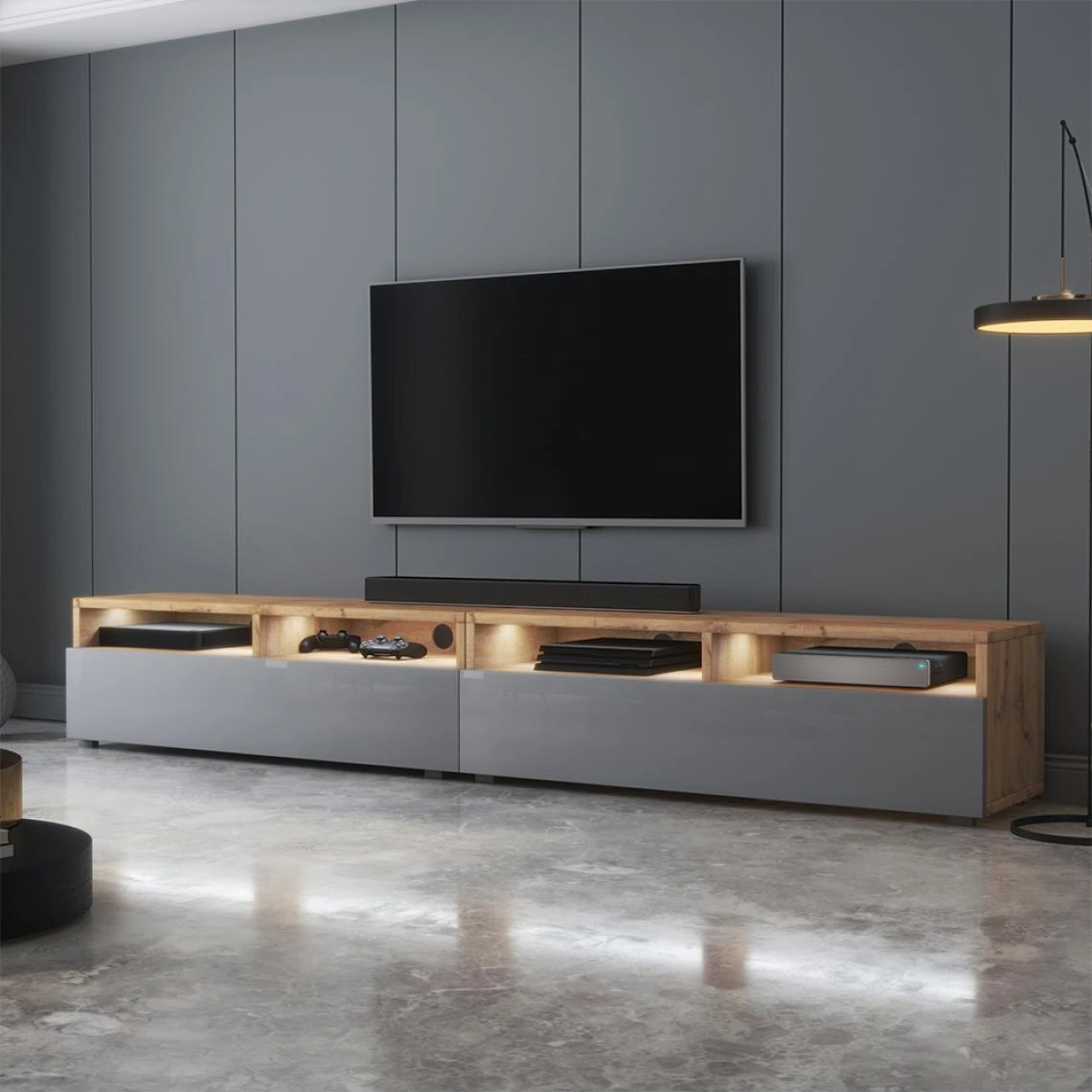Points forts Selsey Meuble TV – REDNAW – 200 cm – chêne wotan / gris brillant – avec LED
