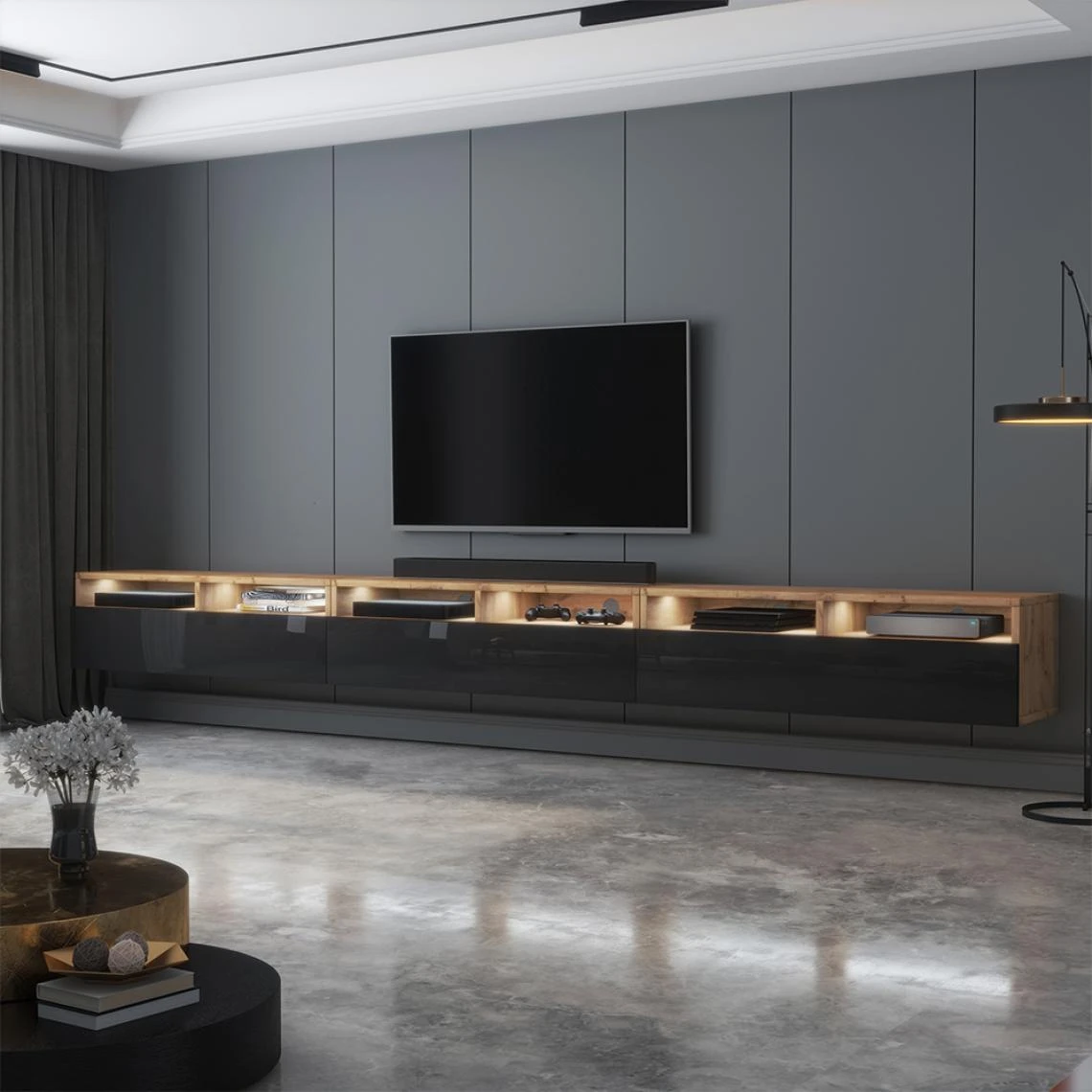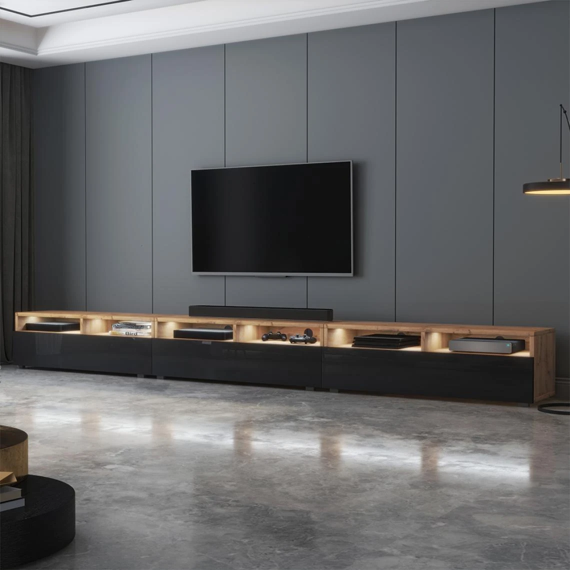 Points forts Selsey Meuble TV – REDNAW – 300 cm – chêne wotan / noir brillant – avec LED
